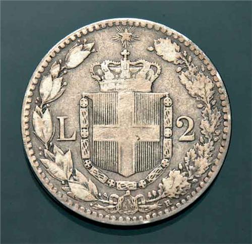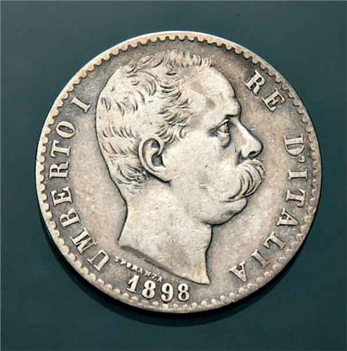 Italy - Umberto I - 2 L. 1889 - Ag - 2 Lire 1898 Zecca: Roma - Diritto: effigie del Re a destra - Rovescio: stemma di Casa Savoia coronato e circondato dal Collare dell'Annunziata entro due rami di alloro e di quercia intrecciati alla base - Millesimo raro