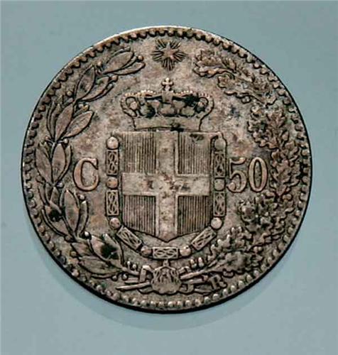 Italy - Umberto I - 50 c. 1889 - Ag - 50 Centesimi 1889 Zecca: Roma - Diritto: effigie del Re a destra - Rovescio: stemma di Casa Savoia coronato e circondato dal Collare dell'Annunziata entro due rami di alloro e di quercia intrecciati alla base -