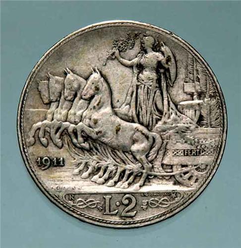 Italy - V.E. III - 2 L. 1911 - Ag - 2 Lire Quadriga Veloce 1911 Zecca: Roma - Diritto: effigie del Re a destra - Rovescio: allegoria dell'Italia ritta su quadriga veloce a sinistra - Millesimo raro