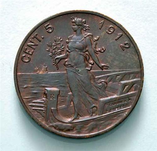Italy - V.E. III - 5 c. 1912 - Cu - 5 Centesimi Italia su Prora 1912 Zecca: Roma - Diritto: effigie del Re a sinistra - Rovescio: allegoria dell'Italia stante su prora a sinistra con ramo d'ulivo -