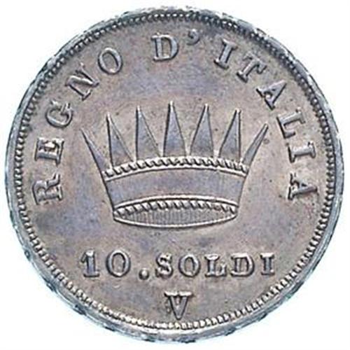 Monete e Medaglie di Zecche Italiane. Venezia. Napoleone I (1805-1814). 10 soldi 1812 V su M. Pag. 26a. RR. AG. Conservazione eccezionale. FDC.