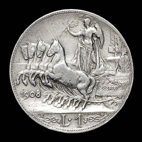 Vittorio Emanuele III (1900-1946) - 1 Lira Quadriga Veloce 1908 Zecca: Roma - Diritto: effigie del Re a destra - Rovescio: allegoria dell'Italia ritta su quadriga veloce a sinistra -