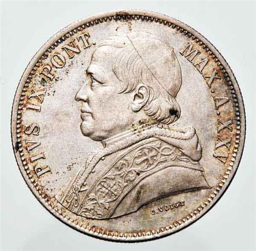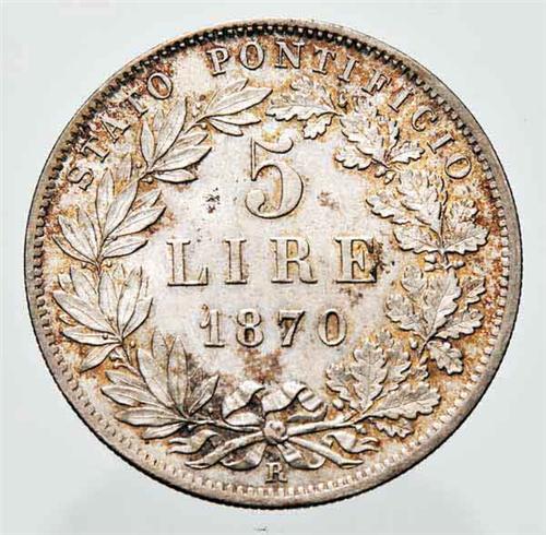 Antichi Stati Italiani - Stato Pontificio - Pio IX (1846-1870) - 5 Lire 1870 anno XXV - Metallo: Ag - Zecca: Roma - Diritto: effigie del Papa a sinistra - Rovescio: valore e data entro due rami di alloro e di quercia annodati alla base - Di qualità molto buona