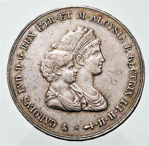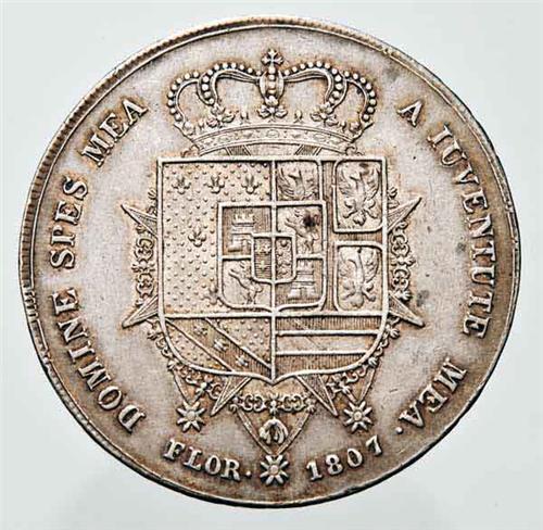 Antichi Stati Italiani - Regno d'Etruria - Carlo Ludovico I di Borbone (1803-1807) - Dena (10 Lire) 1807 - Metallo: Ag - Zecca: Firenze - Diritto: effigie di Carlo Ludovico a destra affiancato a quella della reggente - Rovescio: stemma coronato sovrapposto alla croce di S.Stefano e circondato dal Collare del Toson d'Oro - Di buona qualità
