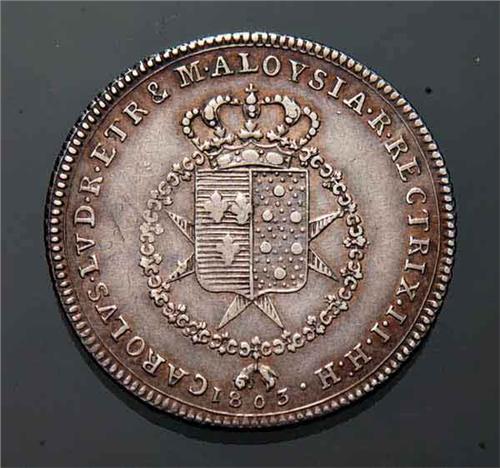Antichi Stati Italiani - Regno d'Etruria - Carlo Ludovico I di Borbone (1803-1807) - Lira 1803 - Metallo: Ag - Zecca: Firenze - Diritto: stemma coronato circondato dal collare del Toson d'Oro - Rovescio: valore entro corona di alloro - Non comune