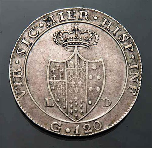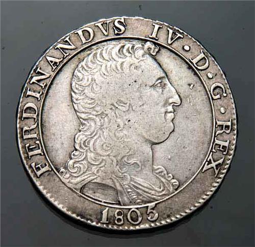 Antichi Stati Italiani - Regno di Napoli - Ferdinando IV di Borbone (1759-1825) - Piastra 1805 - Metallo: Ag - Zecca: Napoli - Diritto: effigie del Re a destra - Rovescio: stemma coronato -