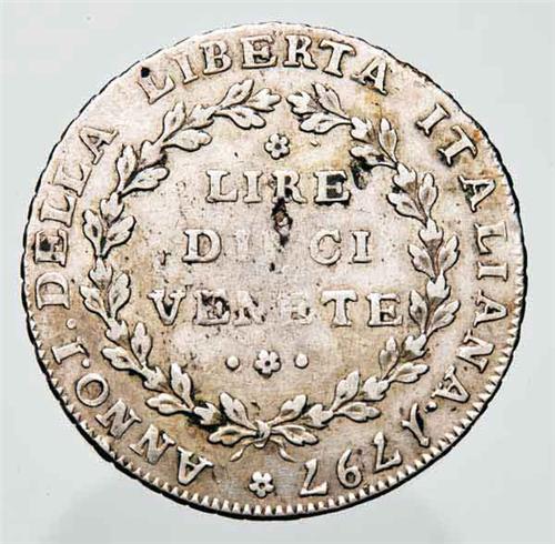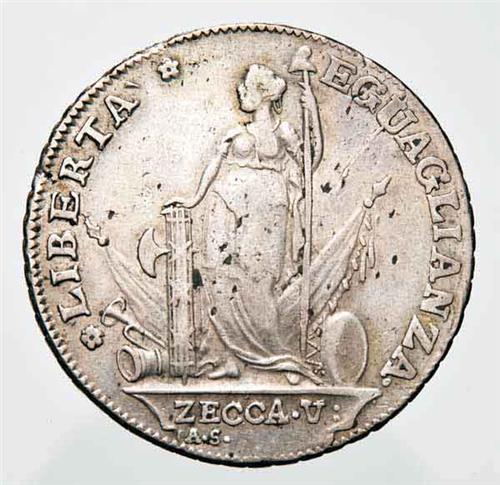Antichi Stati Italiani - Governo Provvisorio di Venezia - 10 Lire venete 1797 anno I - Metallo: Ag - Zecca: Venezia - Diritto: allegoria della Libertà stante con asta e fascio sullo sfondo di bandiere e strumenti militari - Rovescio: valore in righe orizzontali entro corona di quercia -