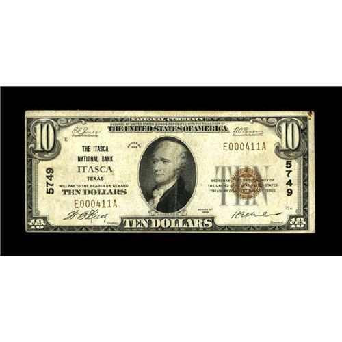 <B>Itasca, TX</B></I> - $10 1929 Ty. 1 <B>The Itasca NB</B></I> Ch. # 5749<BR>A bank which is considerably scarcer in small size than large, with the Kelly census showing just five Series 1929 examples against sixteen large. <B>Fine,</B></I> ex-Irish collection sale.<BR><BR><b>Shipping:</b> Coin/Currency (<a target="_blank" href="http://www.heritageauctions.com/common/shipping.php">view shipping information</a>)
