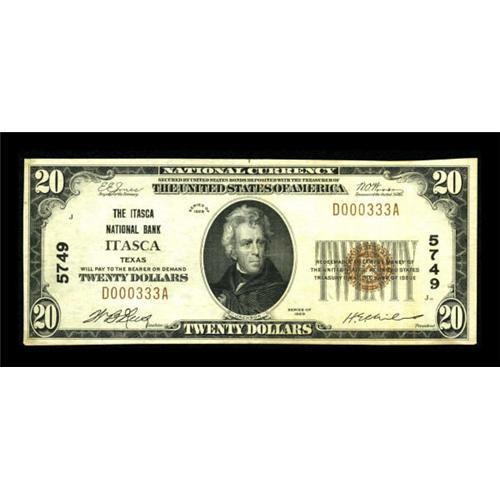 <B>Itasca, TX</B></I> - $20 1929 Ty. 1 <B>The Itasca NB</B></I> Ch. # 5749<BR> Series 1929 notes from this Hill County bank are prohibitively rare, with the census listing just five examples. That includes this piece which also claims the highest grade of the enumerated quintet. <B>Very Fine-Extremely Fine.</B></I><BR><BR><b>Shipping:</b> Coins & Currency (<a target="_blank" href="http://www.heritageauctions.com/common/shipping.php">view shipping information</a>)