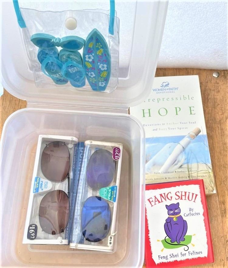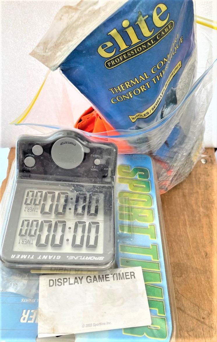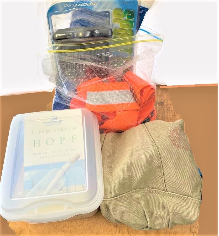 Canvas Bag, Boos, Clip on sunglasses, High Visibility Strips, Kitchen Timer, Thermal Shoe Insoles, inspirational books, thermal insulated water bottle