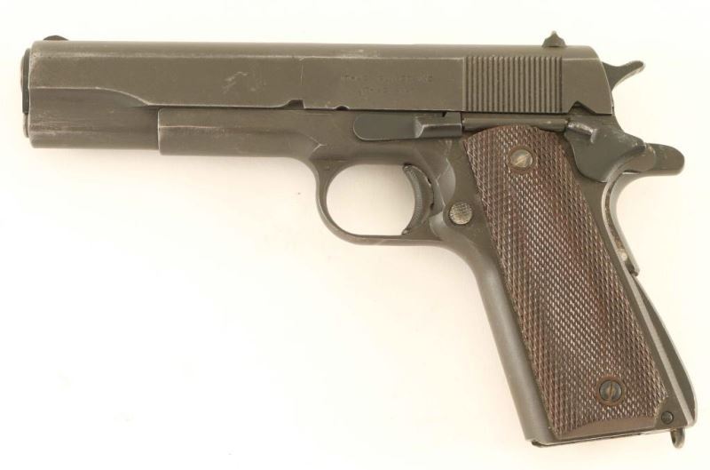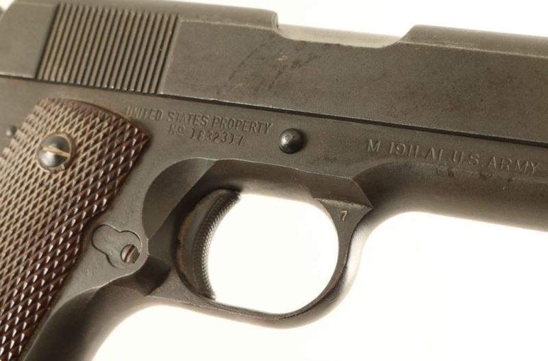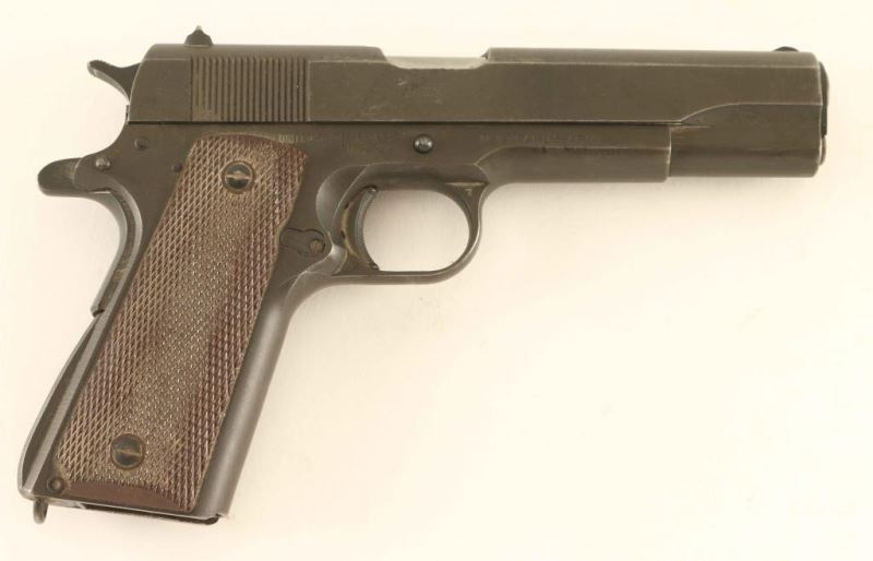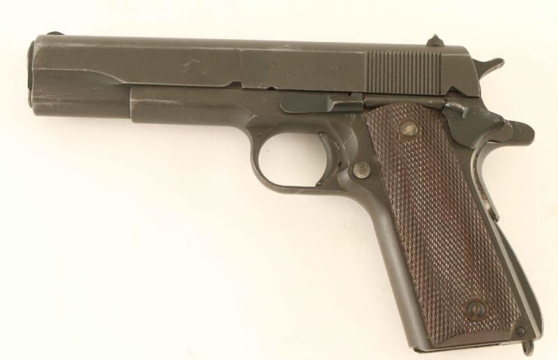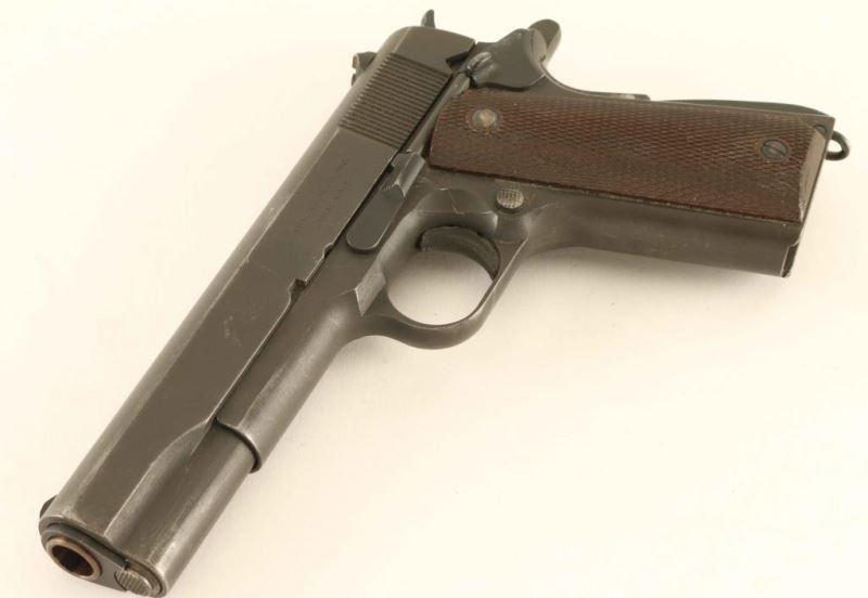 U.S. Military contract single action semi-automatic service pistol chambered in .45 Auto, manufactured circa 1945. Features a parkerized finish, 5" barrel, low-profile serrated ramp front sight, dovetailed rear sight with square notch, knurled trigger, serrated hammer spur, manual safety on the left side of the frame with serrated thumb piece, beavertail grip safety, no magazine, serrated arched mainspring housing with lanyard loop, and two-piece checkered brown nylon grips. Markings: Slide - "ITHACA GUN CO. INC./ITHACA,N.Y." & "P." Frame - "UNITED STATES PROPERTY," "No 1832317," "M 1911 A1 U.S.ARMY," [crossed cannons], "FJA," "P," "7," & [Ithaca chalice shaped proof]. and no markings on the aftermarket barrel. Pistol retains approximately 80% of it's thinned original finish showing honest wear. Action is smooth, the bore is excellent, and the plastic grips are good. Condition is NRA Good+++. ***C&R Firearm***