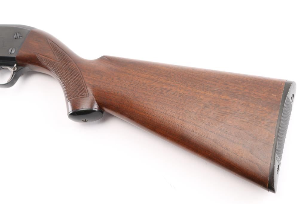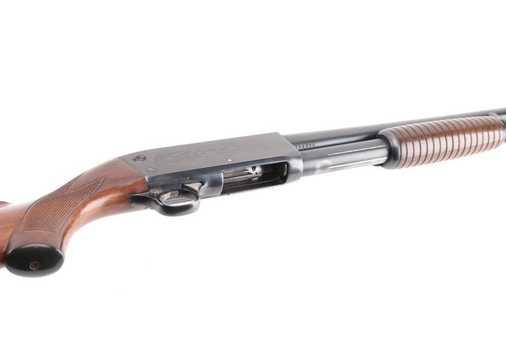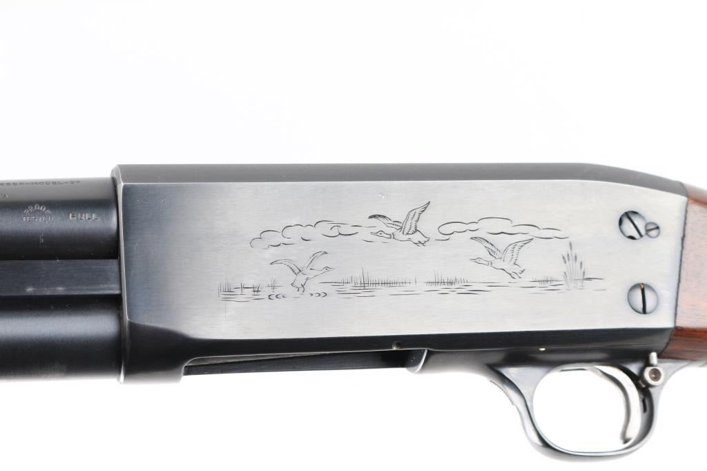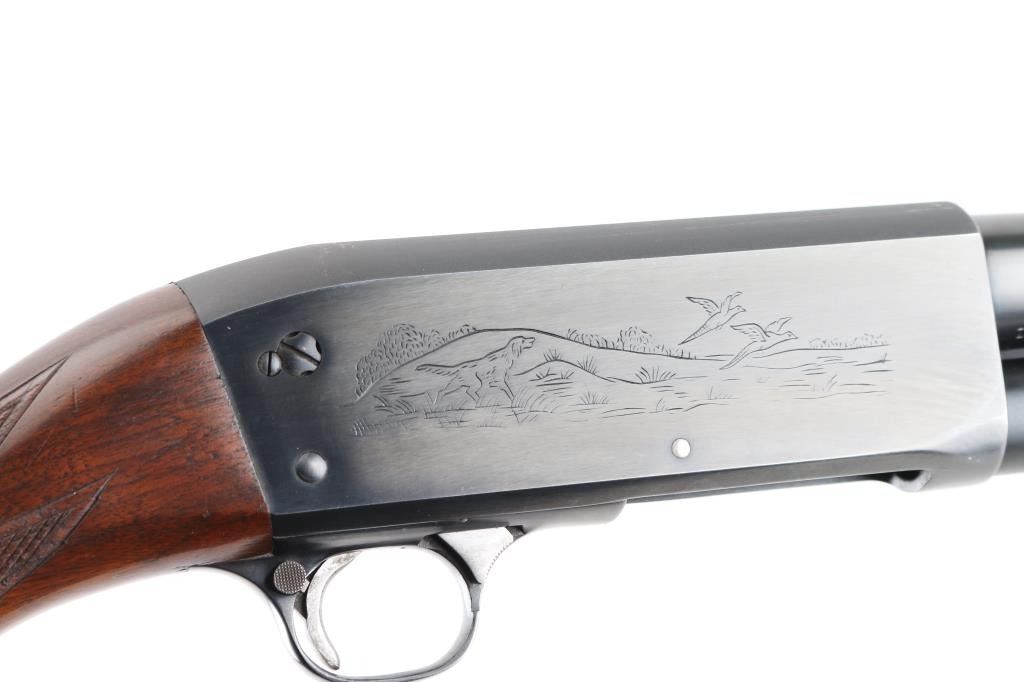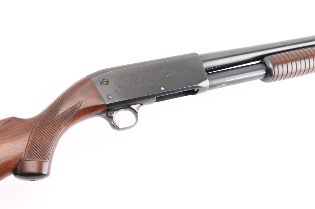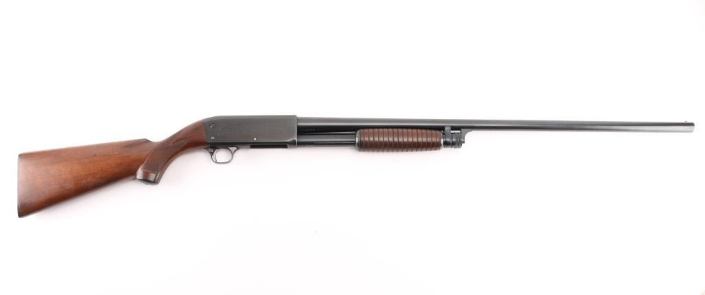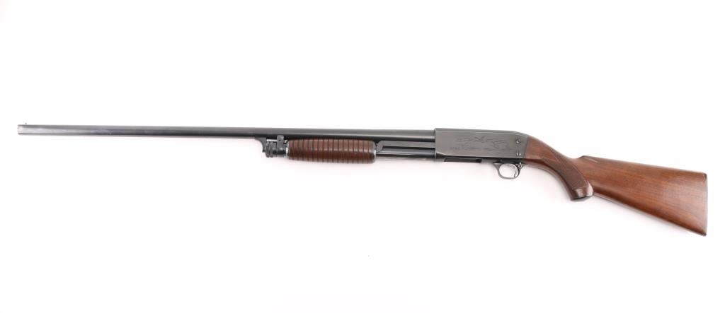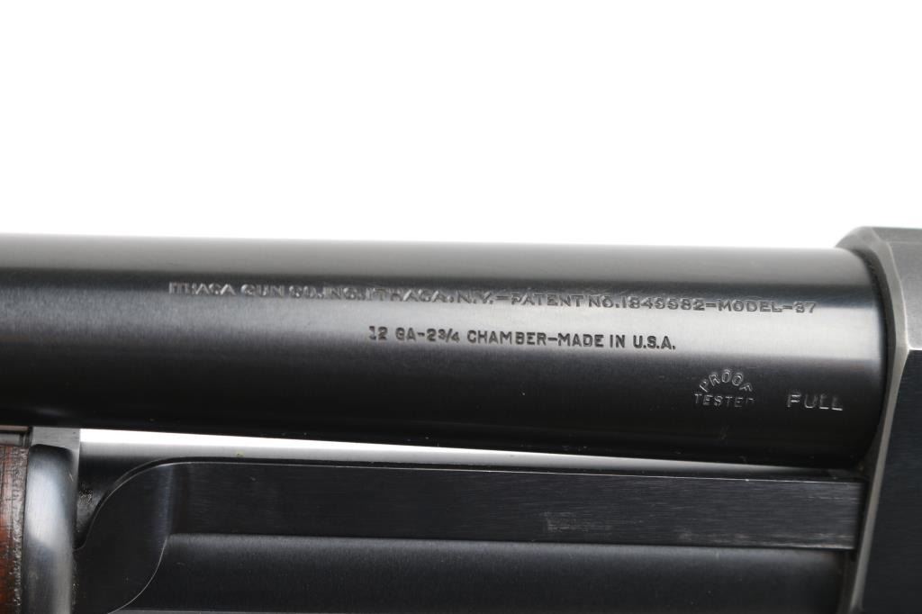 Vintage bottom ejecting pump action repeating shotgun chambered in 12 Gauge for 2 3/4" shells, manufactured in Ithaca, NY circa 1949. Features 30" plain barrel, FULL choke, brass bead front sight, LOP 14", roll stamped game bird and dog scenes on the receiver, push button safety, single action bar, grooved walnut pump handle, pistol grip shoulder stock with checkering at wrist, grooved plastic factory buttplate. Bore is excellent. Shotgun retains 98% blued finish showing some edge losses & small patch of pitting on left end of barrel, rubbing wear on moving parts, scattered light patina, small oval patch of pitting on barrel. Wood is excellent with little to no scratches. Barrel numbered to receiver. Condition is NRA Excellent. *** C&R Firearm ***