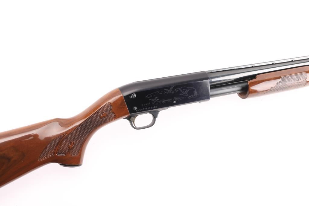 'Ultrafeatherlight' pump action shotgun manufactured circa 1981. Accepts 2-3/4" 20 gauge shells. Bottom ejecting. Features 25" vent rib barrel, choked "MOD", red polymer Bradley bead front sight, roll stamped game bird scenes on the receiver, single action bar, walnut slide handle and pistol grip shoulder stock with impressed checkering, ventilated rubber recoil pad. Bore is very good condition. Shotgun retains 90% of its original blued finish showing handling marks, some edge losses and minor discoloration to front portion of receiver. Wood is very good condition, showing few small dents or other blemishes to the urethane finish. Condition is NRA Very Good+ *** Modern Firearm ***