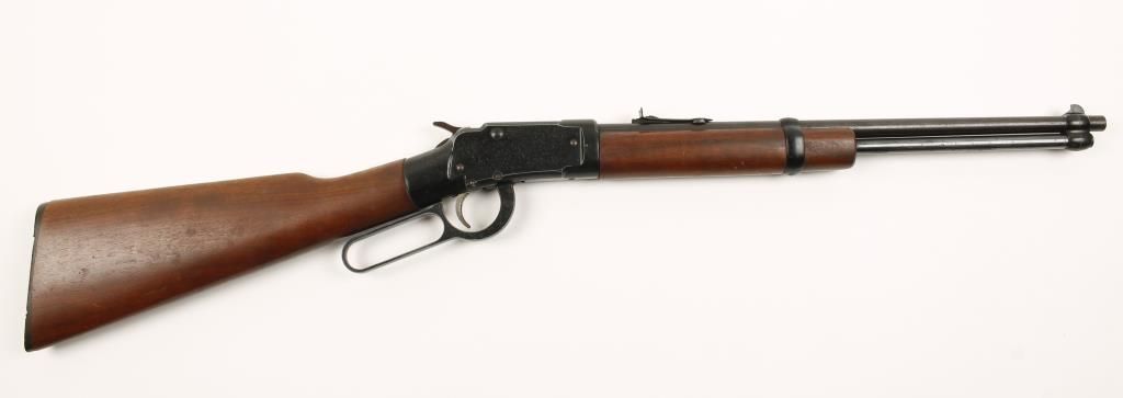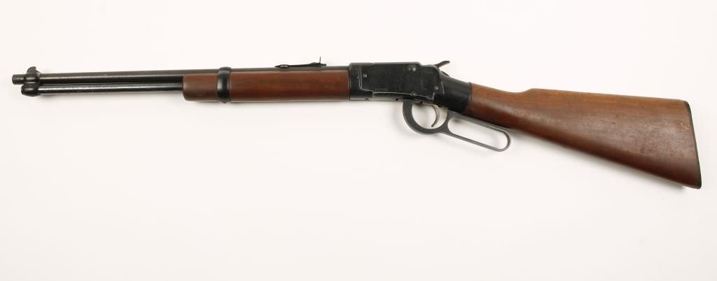 Scarce single shot lever action carbine. Has a sloping block action like a Martini. 18.5" barrel with bright bore and strong rifling. Steel barrel, breech block, hammer and trigger. Alloy receiver and lever. Wood is in good shape with original butt plate. Condition is good.