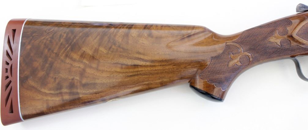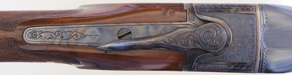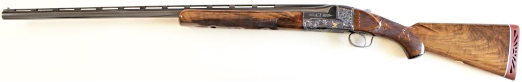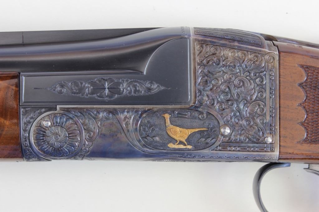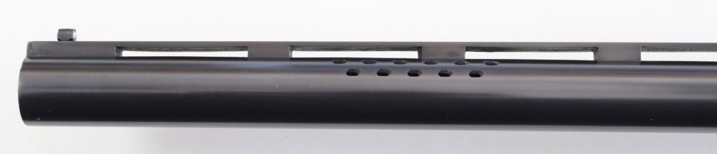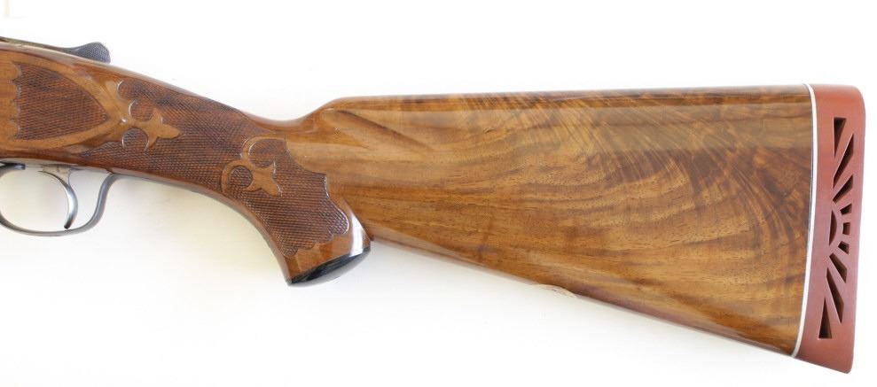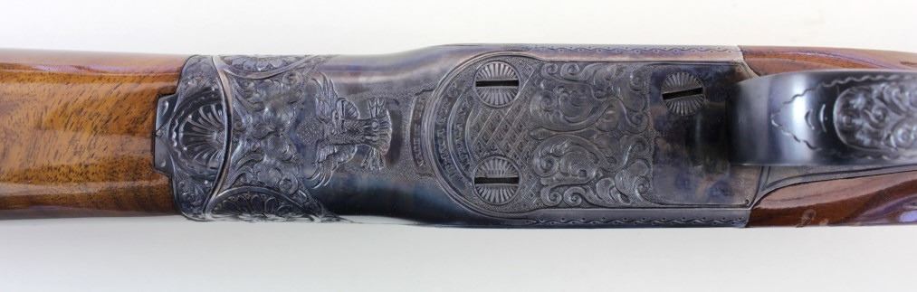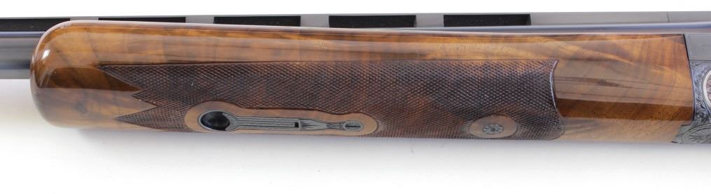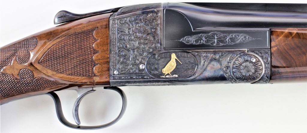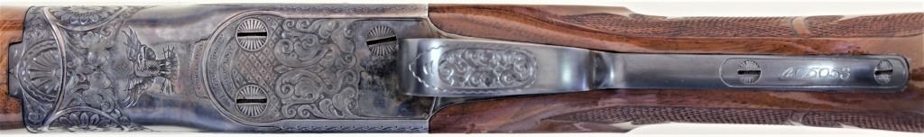 Ithaca 5E Knick 12 ga. SN 45053 factory engraved single barrel trap shotgun made in 1963. Solid fine 95% condition with features including 30" matted vent rib barrel which has been ported early on, double bead sights, ejector and engine turned slats. Recfactory engraved single barrel trap shotgun made in 1963. Solid fine 95% condition with features including 30" matted vent rib barrel which has been ported early on, double bead sights, ejector and engine turned slats. Receiver displaysbeautiful case colors and deep engraved 5E scroll and floral panel fine stippled backgrounds, thick multi colored gold bird inlays on both sides, attributed to factory engraver Justin Michelina. Bottom show eagle with arrows over MADE IN USAover Ithaca Gun C. ITHACA N.Y. bottom of trigger guard engraved to match. Beartiful walnut stocks show high figural grain, fine fleur de lis checkering, beaver tail forend matching including engraved hardware buttstock is fitted withoriginal sunburst Ithaca rubber pad, gold escutcheon with engraved HCO initials on bottom. This 5E remains a fine well cared for example, buttstock showing 3 or 4 very minute handling mars and dings, mechanically excellent with mirrorbore. LOP 14 1/4", DAC 1 1/2" DAH 1 1/2". From old St. Louis collection. Est. 2500-4500