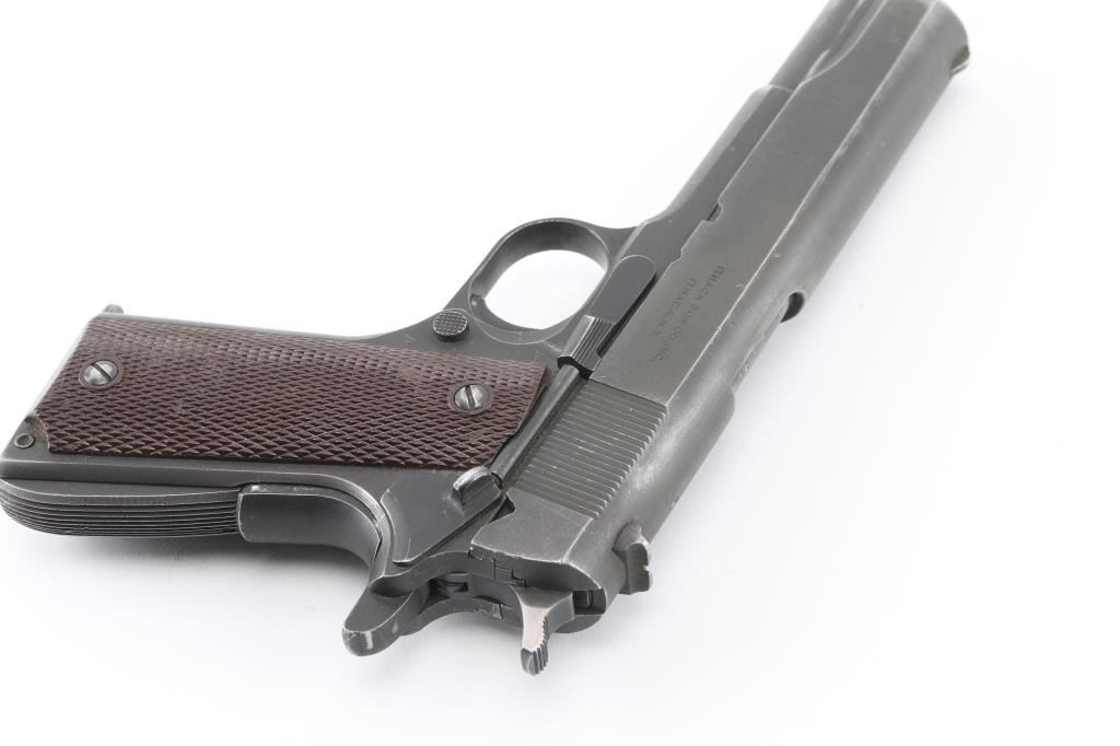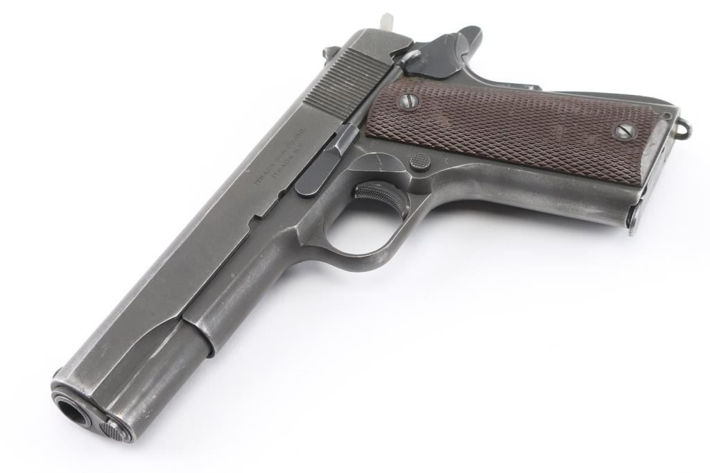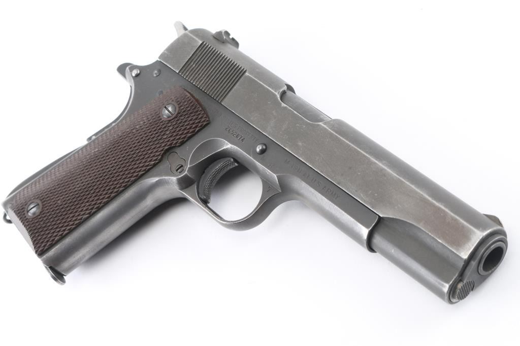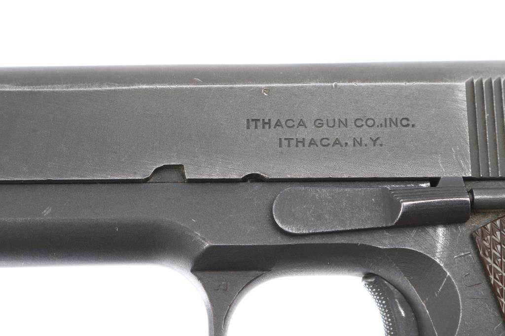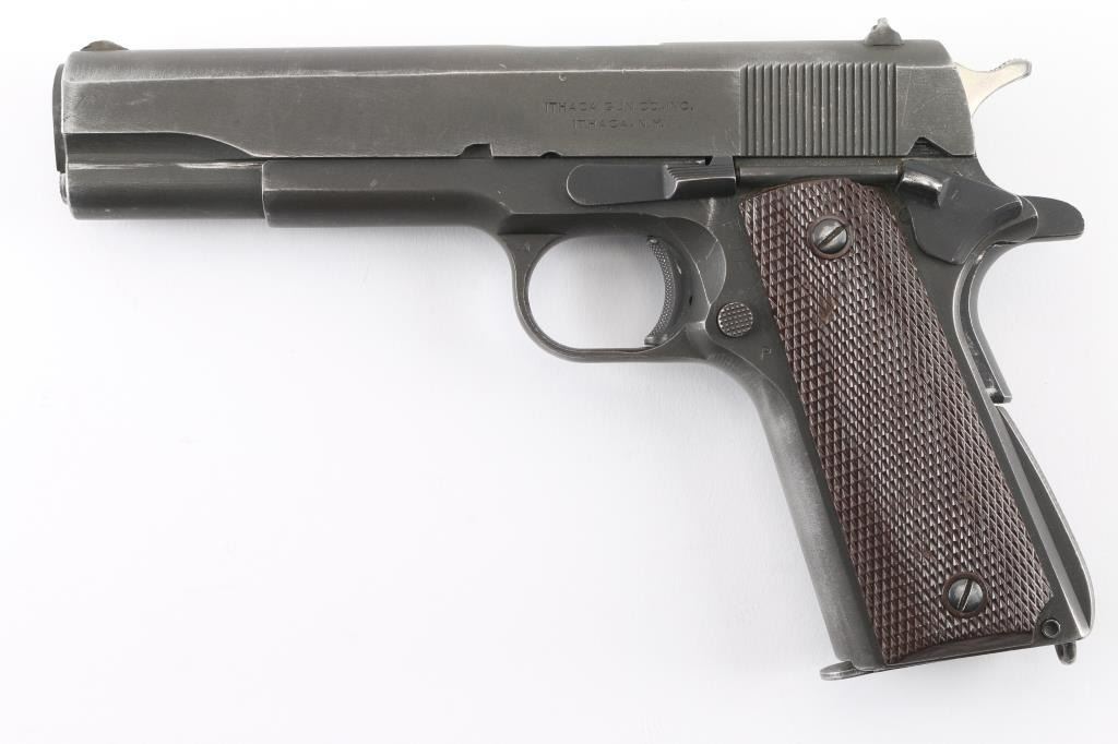 Sn: 2652874 U.S Military WWII era semiautomatic pistol manufactured circa 1945. One of the last M1911A1's produced. Features parkerized finish, checkered brown plastic grips, 5" barrel, fixed front & dovetailed rear sights, single action trigger, grip safety, manual safety, serrated arched mainspring housing with lanyard loop, serrated hammer with polished sides. Bore is very good condition. Appears refinished, with 85% coverage of medium gray parkerizing, with edge losses, scratches, especially around slide stop. Grips are very good. Grip screws show damaged slots. Markings include: "ITHACA GUN CO, INC" with address on slide, "UNITED STATES PROPERTY", "M1911A1 US ARMY", "P" behind mag button and top of slide, "FJA" below slide stop, "7" and (horseshoe shape stamp) on trigger guard (other marks hard to read), "MR" and faint crossed cannons on right frame. Includes (1) good condition blued steel magazine. Condition is NRA Very Good++ (as arsenal refinished) *** C&R Firearm ***