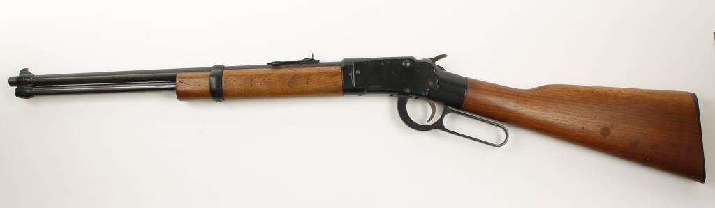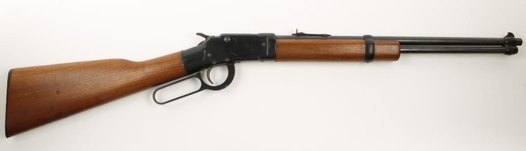Lever action single shot rimfire carbine with 18-1/2" barrel. Blued finish, alloy receiver, plain straight grip wood stock and forearm and black plastic butt plate. Good bore and action. Condition: Good showing scratching to receiver and small ding on lever. Wood is good.