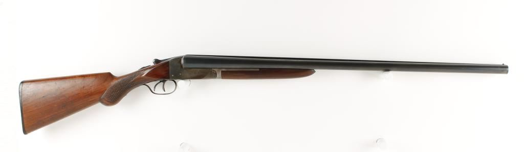 Early double barrel hammerless shotgun with blued 28" barrels. case colored receiver, checkered semi pistol grip walnut stock and forearm, double triggers, tang safety and plastic butt plate. Good bores and good action. Condition: Good overall showing thinning case coloring and bluing is good. Wood is good showing light bruising and scratches.