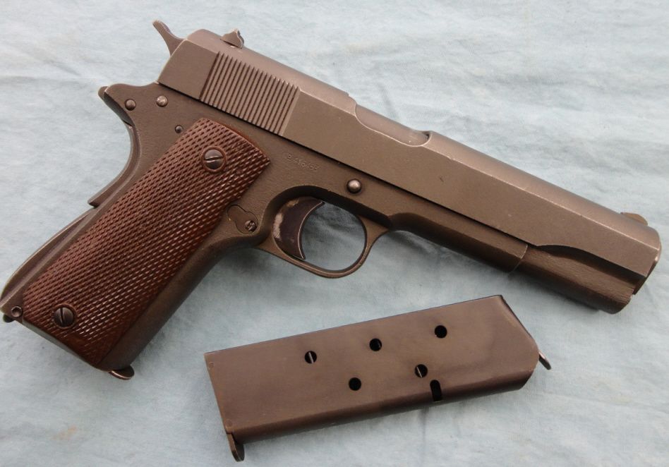 #416453; 45 ACP. Frame is marked United States property w/AA inspector marks. Complete w/extra magazine. In very good overall condition as gun appears to be arsenal finished.