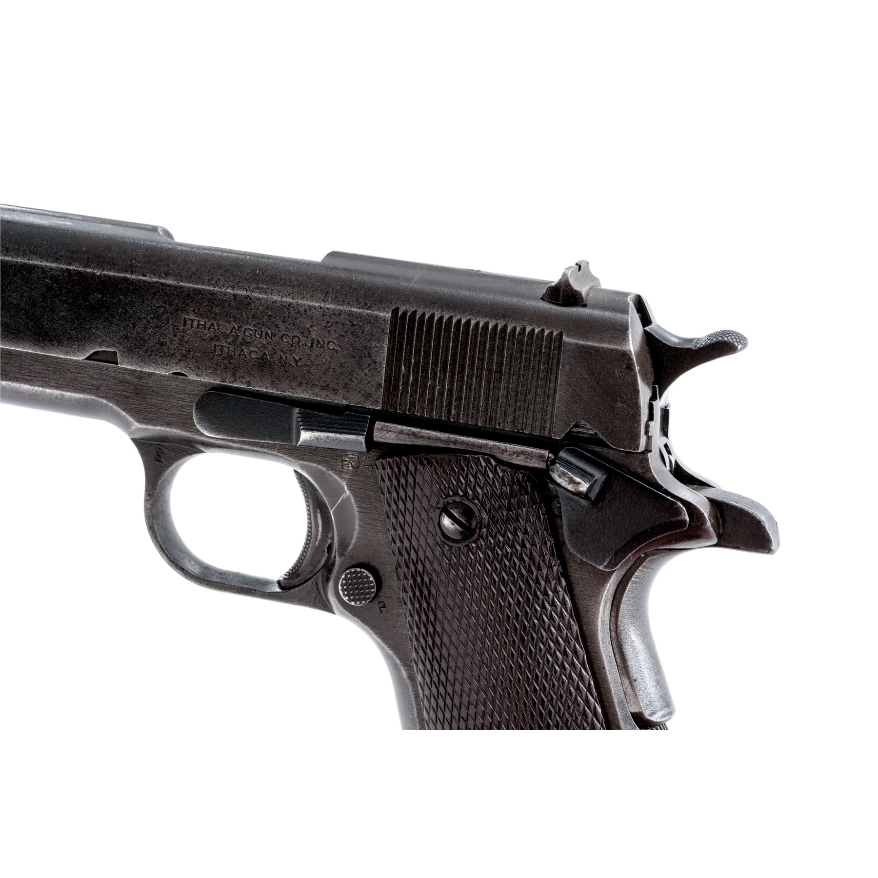 U.S. 1911-A1 Semi-Automatic Pistol, by Ithaca, #1893469, .45 ACP cal., 5'' ''F'' marked Flannery barrel, parkerized finish, brown checkered Keyes Fibre plastic grips with small reinforcing rings, and one post-war Colt magazine. Condition is very good and appearing mostly original, except magazine. Approx. 40% original finish remains with very light spray pitting. Grips with mild wear. Good action, very good bore. A cool old pistol that looks like it's been there. Est.: $600-$900. (C&R)