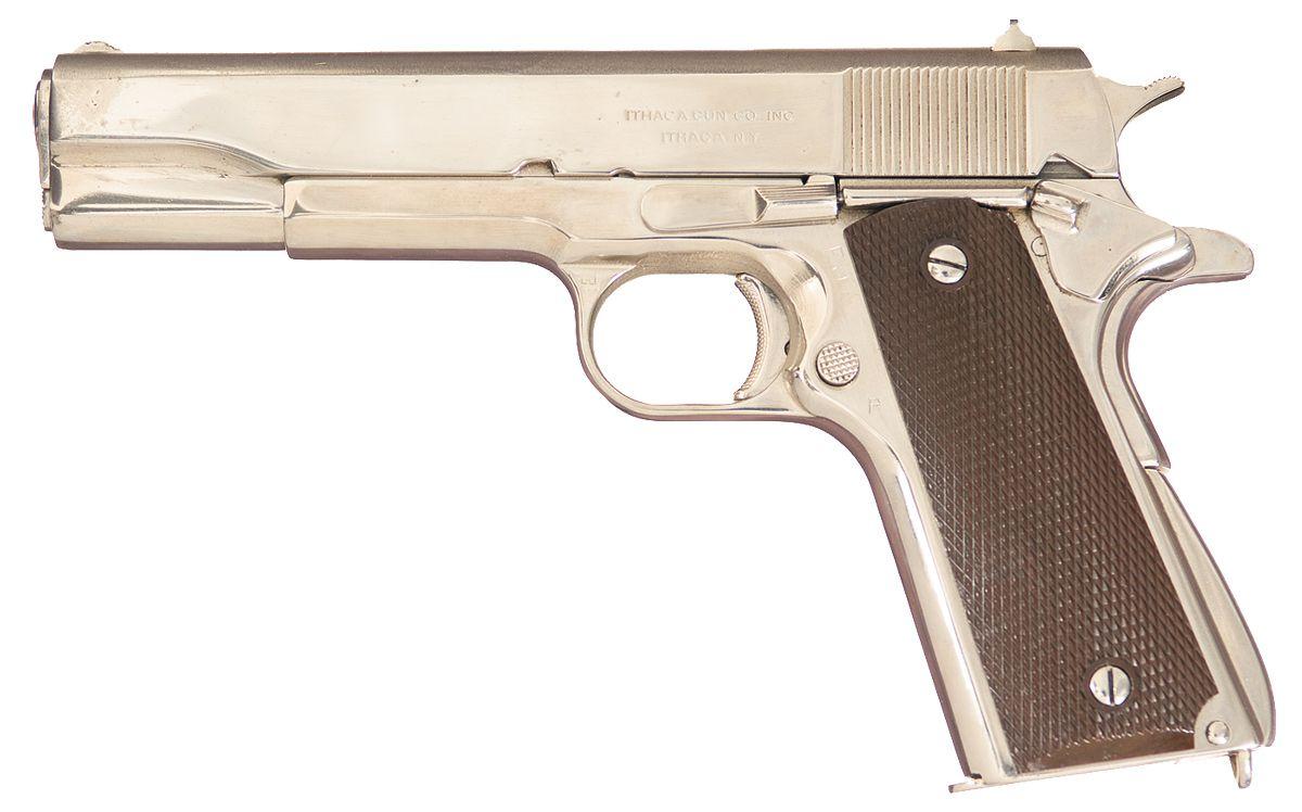 This is a 1945 production U.S. Army contract pistol as produced by the Ithaca Gun Company. The left side of the slide is marked "ITHACA GUN CO. INC / ITHACA N.Y." and the top of the slide has a single "P" proof in front of the rear sight. The left side of the frame is marked "FJA" for Frank J Atwood, the U.S. Government Inspector, and a single "P" proof next to the magazine catch. The right side of the frame is marked "UNITED STATES PROPERTY" over the serial number and "M1911 A1 U.S. ARMY". There is a faint crossed-cannon Ordnance proof by the hammer pin hole. It has a Flannery barrel marked "F" and "P" on the side of the lug. It has a serrated slide stop, thumb safety, hammer and arched mainspring housing. The grips are the correct wartime versions manufactured by the Keyes-Fibre Company that have a single five-pointed star with a "K" and a single mold number, both located on the inside of the grips. The pistol has been refinished in nickel, including the magazine, with a non-glare finish on top of the slide.
