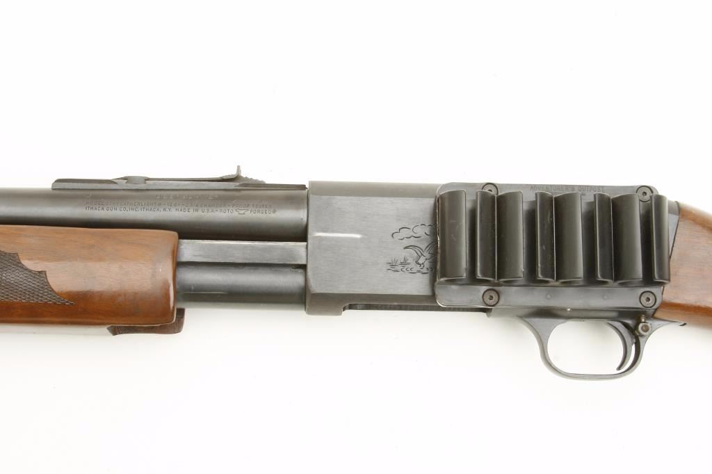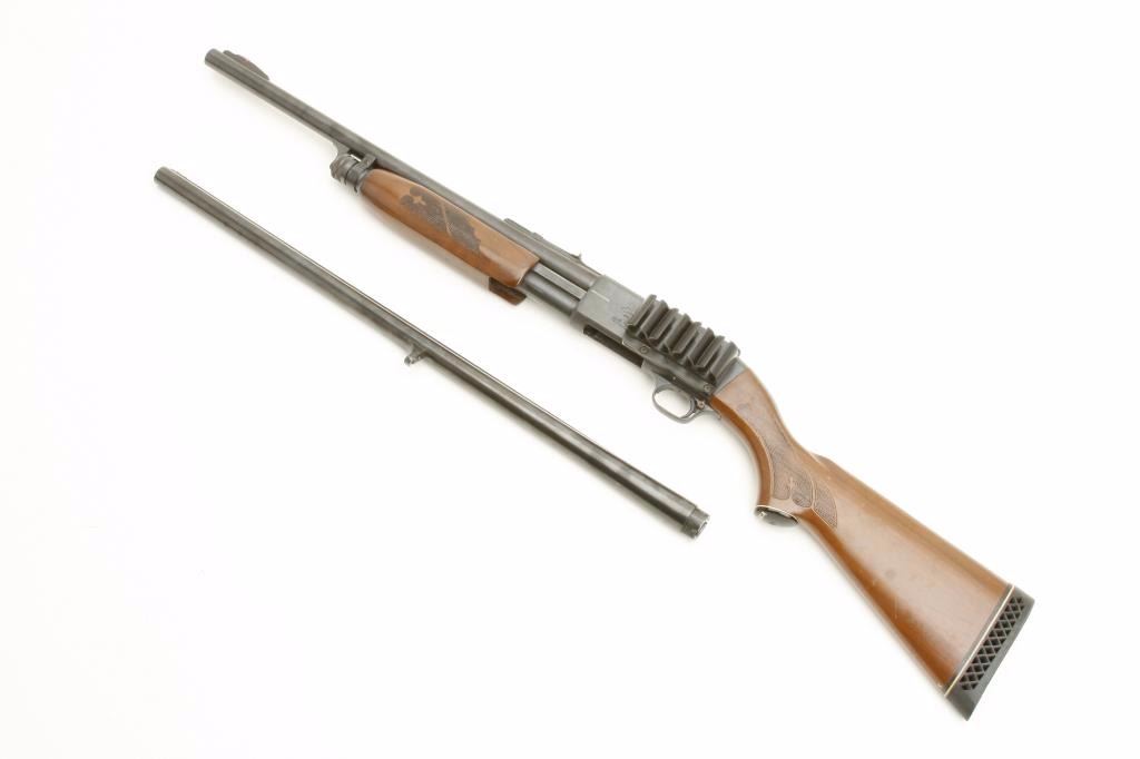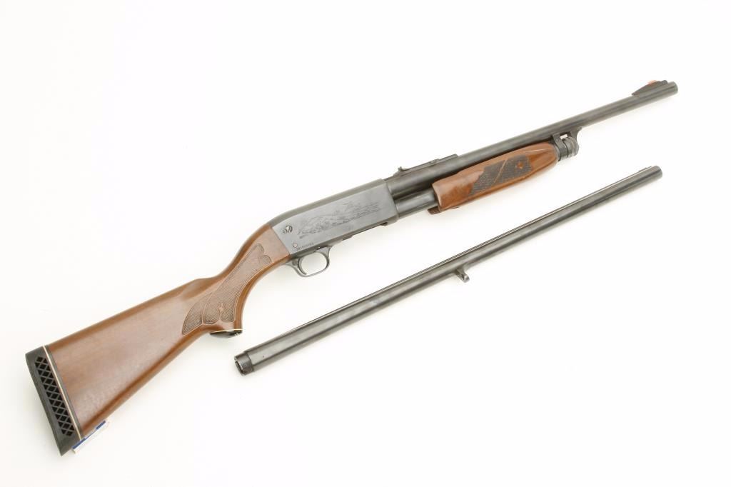 12GA, S/N 381009785 with two barrels measuring 19 ½” and 25 ½”. Engraved with dogs and ducks on both sides of the receiver and mounted with a shell hold on the left side. The stock and fore end show dings and marks. 80%-90% blue on the receiver and both barrels. Vent rib on the 25 ½” barrel. This is a great home defense shotgun as well as a versatile hunting tool. (Modern) Est.: $300-$600