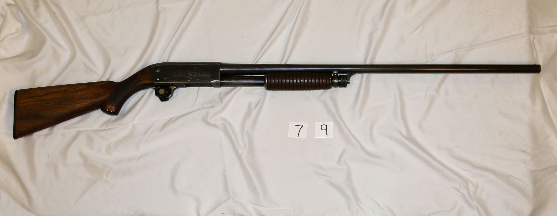 Ithaca Model: 37 Caliber: 12 GA Serial No. 201345 Description: pump with engraving, full choke