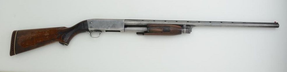 Ithaca Model 37 pump action shotgun, 12 gauge, 28” barrel with added ventilated rib, checkered wood stocks, #371072536. This gun is in overall fair condition showing traces of blue, good bore, action and markings, oldmajor damage to fore end, butt stock shows considerable loss and wear to finish, hard rubber butt pad added. From an old estate. Est.: $150-$300.