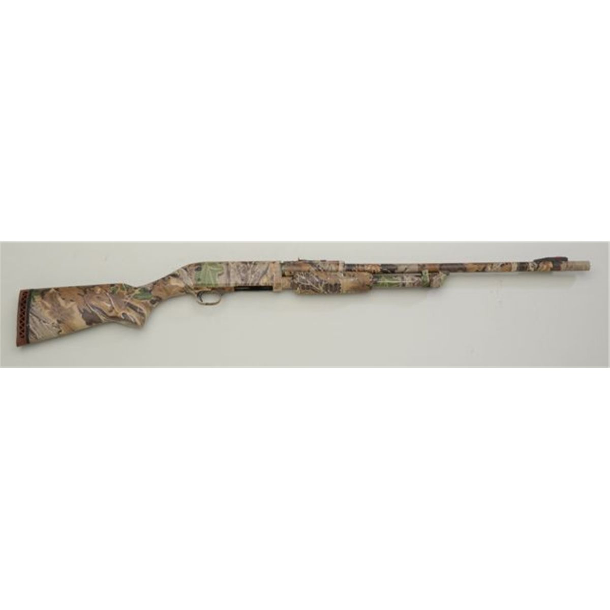 Ithaca Model 37 pump action shotgun, 20 gauge, 24” barrel, camouflage covering on entire gun, #M370006230. This gun is in overall excellent condition showing approx. 99% woodland coverage, fine bore, crispaction, red hard rubber butt pad. Est.: $150-$300.