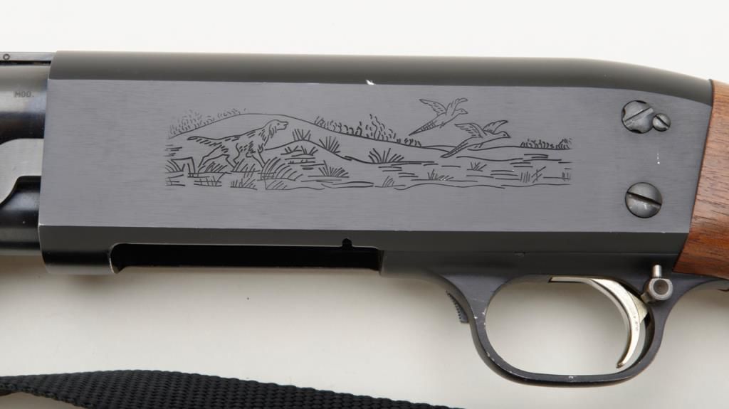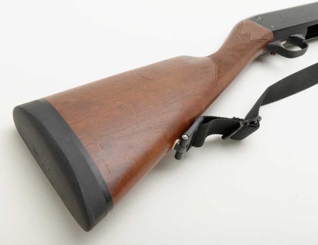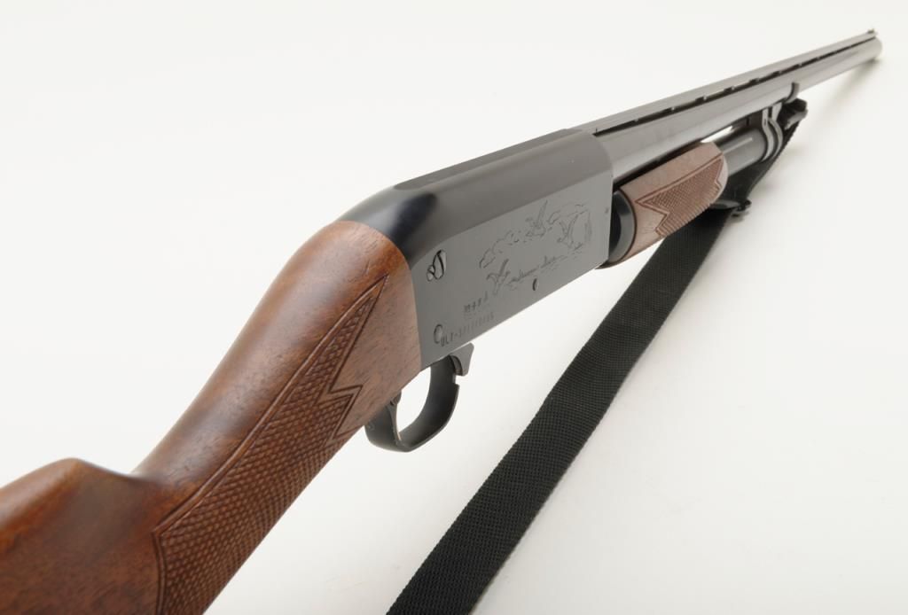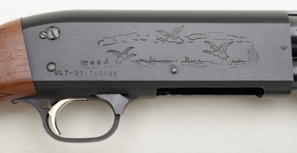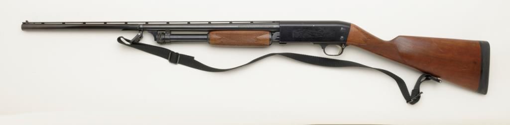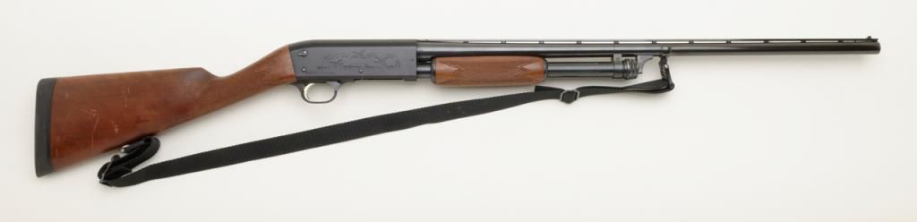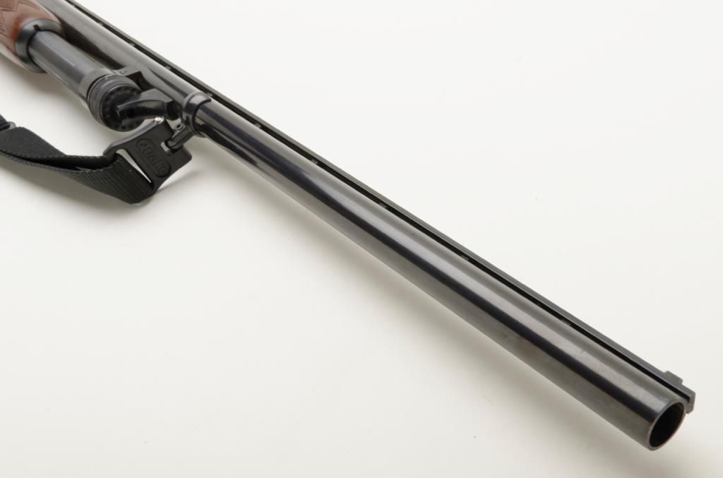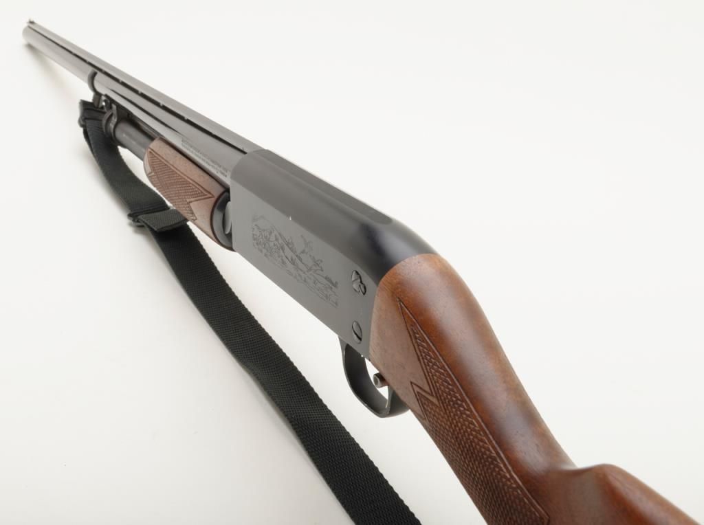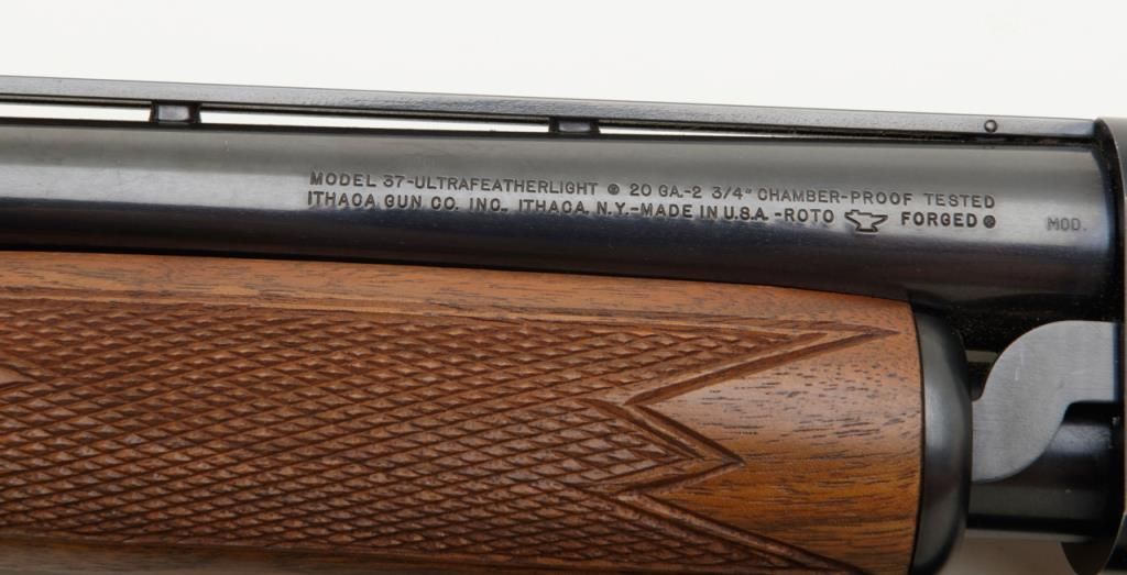Ithaca Model 37 ultralight 20 gauge pump action shotgun with factory 26” barrel, English style straight stock, ventilated rib, quick detachable sling swivels and sling added along with hard rubber extended recoil pad. The shotgun is choked modified. The condition is fine to excellent with a little use, some minor loss of finish at operating areas and a couple of minor scratches and marks. 97% to 99% overall. Est.: $200-$400