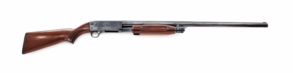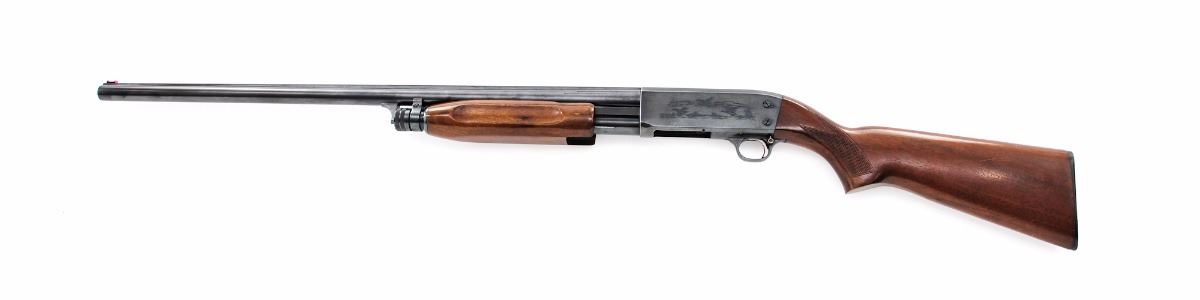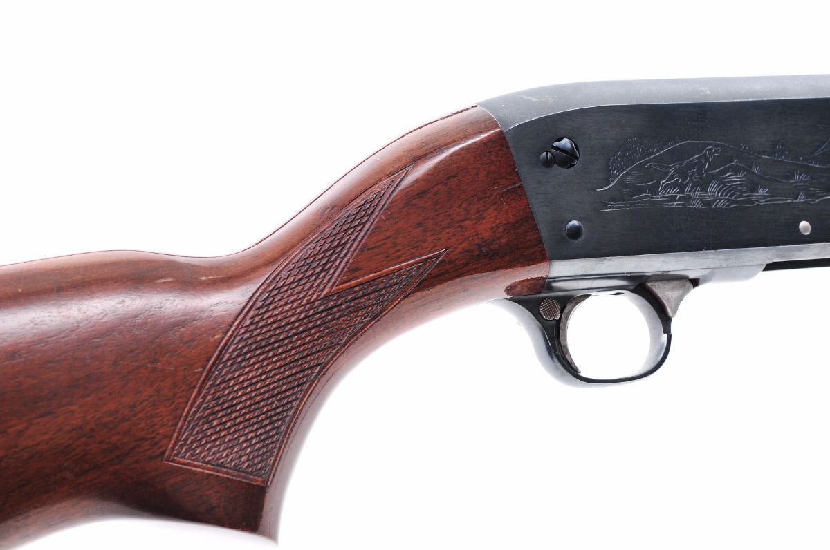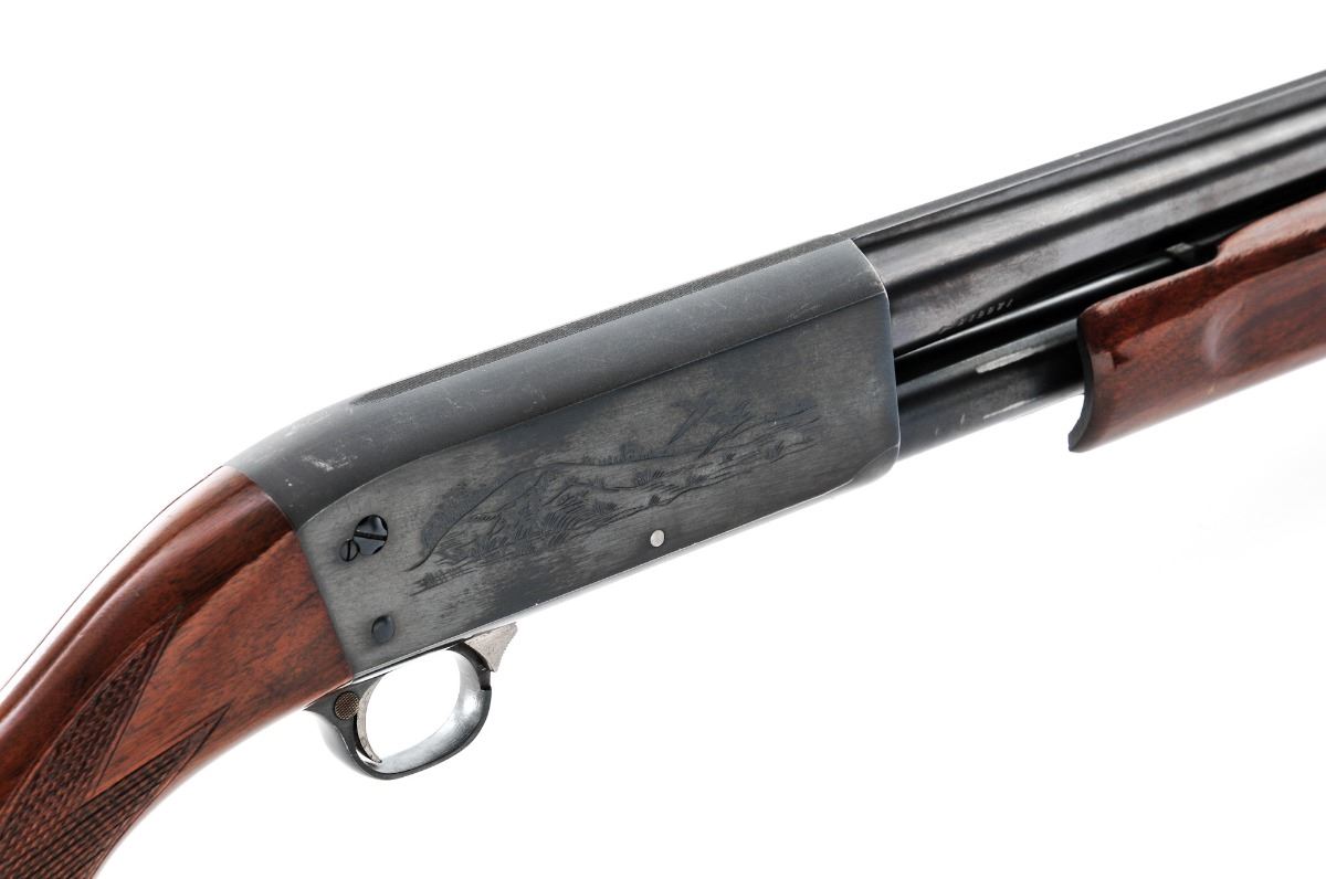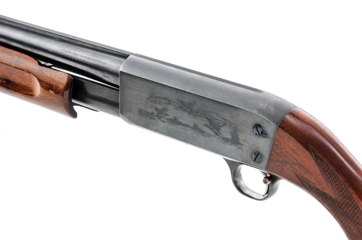 Ithaca Gun Co. Model 37R Featherweight Slide Action Shotgun, #725513-4, 12 ga., 2-3/4'' ch., blue finish, 28'' barrel with 1/4'' matted solid rib and Ithaca orange resin front sight with a Full choke; receiver has light game scene engraving with a triggerguard mounted push-button safety; checkered pistol-grip walnut stock and fingergroove handle have a varnished semi-gloss finish. Length of pull is 14'' to a grooved Ithaca black plastic buttplate; weight is 7-1/8 lbs. Mfg'd ca. 1958. Condition is good with a lightly fouled and oxidized bright bore; magazine tube has cycling scuffs. Stock has a reattached 6'' chip on the toe line with other scratches and small dents. Est.: $150-$300. (C&R)