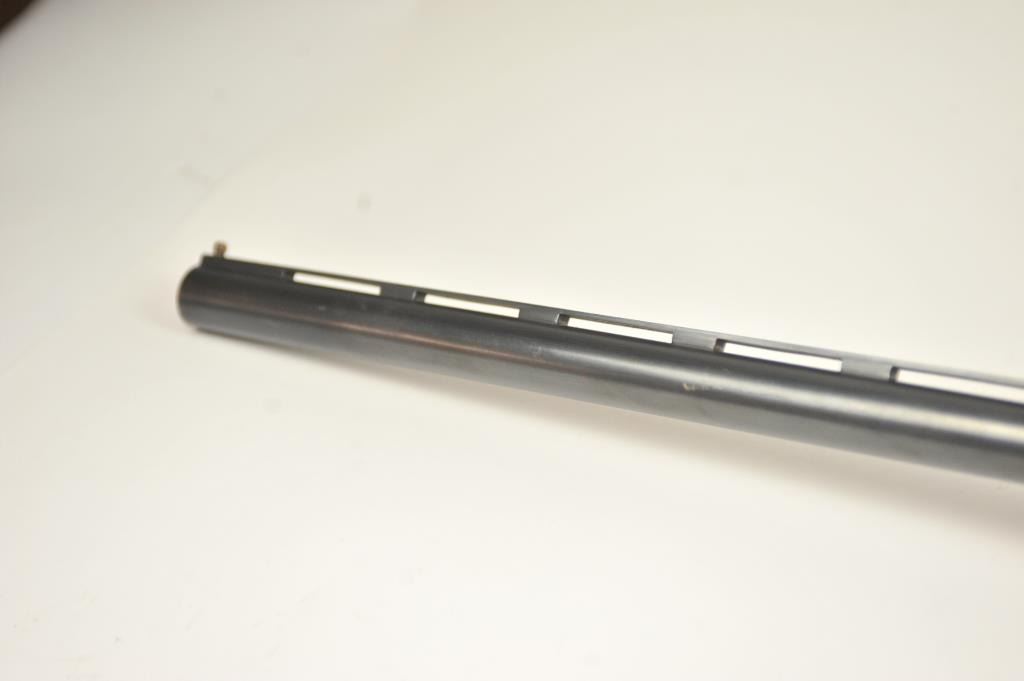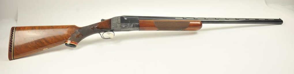 Ithaca Model 4-E, 12 gauge, single barrel Trap shotgun with a 30” Improved Modified to Full choked barrel. The shotgun is nicely engraved with trap shooter on the left side and an American eagle on the right,surrounded by quality scroll engraving. The select fancy checkered wood stocks are fine. The barrel and frame retain 90-95% original toning blue finish and case colors with some minor loss and normal aging. The stock hasbeen professionally refinished and spacers added to extend the pistol grip cap. The wood still fits well and is not down against the metal indicating little to no sanding. The stocks are very good with some scratchesand sharp carving. The LOP is 13” to the end of the wood and 13 ¾” to the end of a thin pad (with a thicker pad, the LOP would easily extend to 14”-14 ¼”). The pad is only ½” thick. A nice 4-E with exceptionally goodengraving. Est.: $1,500-$3,000. (C+R).