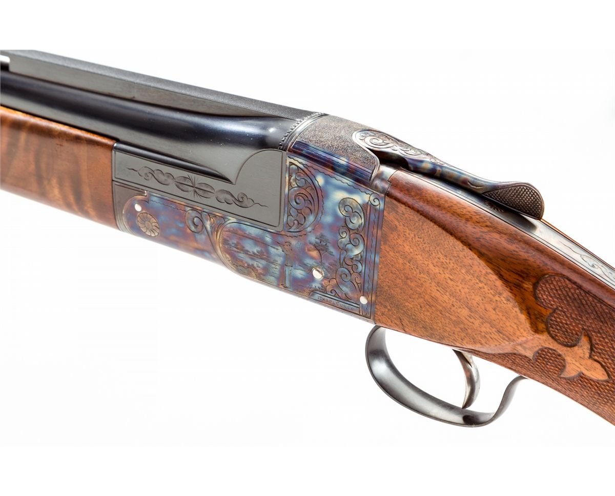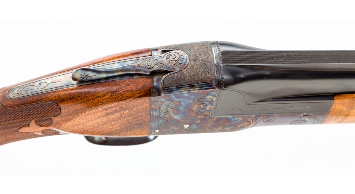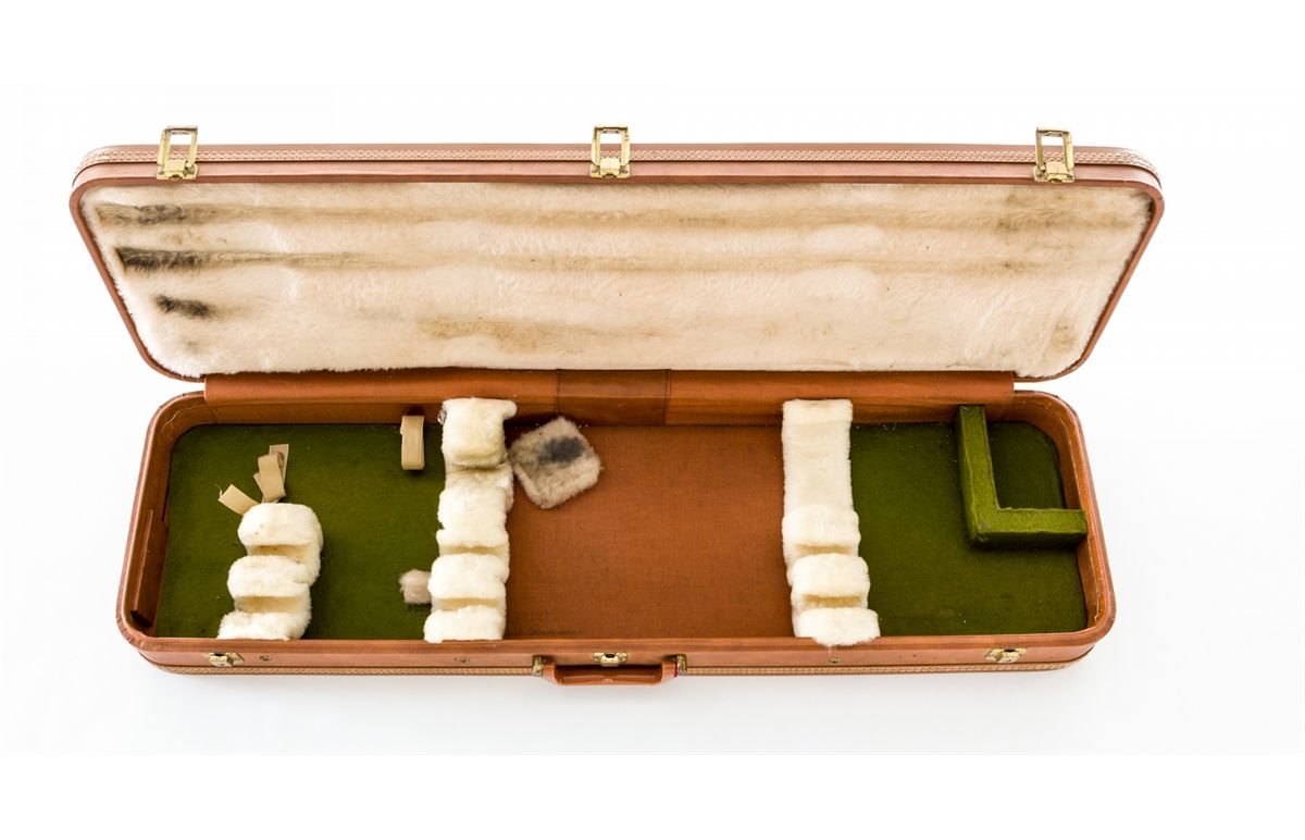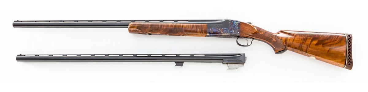 Ithaca Model 4E Trap Two-Barrel Set, #404944, 12 ga., 30'' Full choked blue barrel & 32'' Modified choked blue barrel, both with double bead sights and light engraving; engraved case hardened receiver, left side with standing shooter and right side with archer, as factory engraved by Bill McGraw, fleur d'lis pistol-grip fancy walnut stock and handguard, with Pachmayr Whiteline rubber butt pad. All nicely presented in a Browning type luggage case fitting both barrels, forends and actions. Mfg'd 1961. Condition is excellent. Barrels retain approx. 98% original blue. Case colors are extremely vibrant showing only the slightest thinning at balance point. Stock with minor marks from handling. Length of pull to end of wood: 13-1/2''; 14-3/8'' to end of pad. Drop at comb: 1-1/2''; drop at heel: 1-7/8''. Est.: $3,000-$5,000. (C&R) (Ernest A. Bryant III estate)