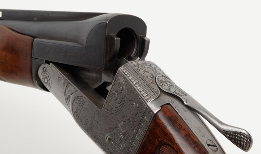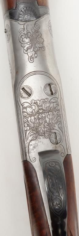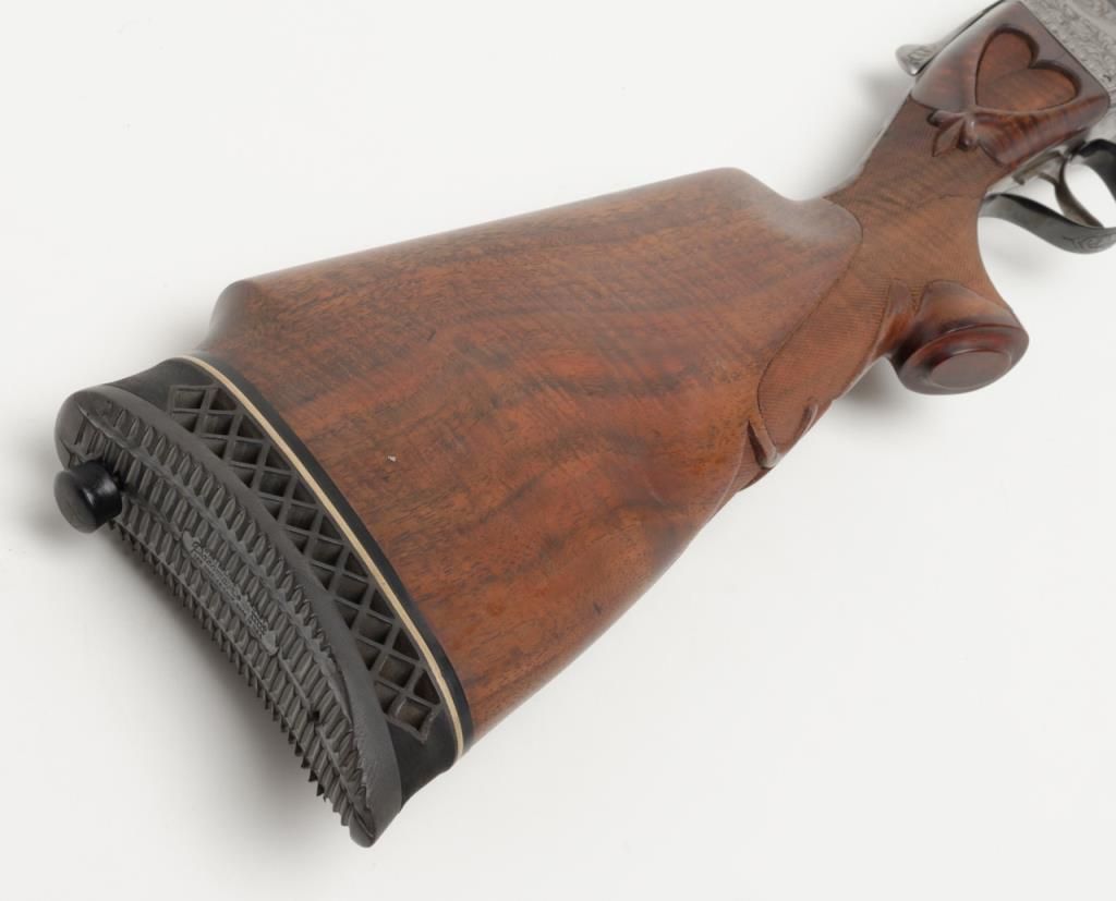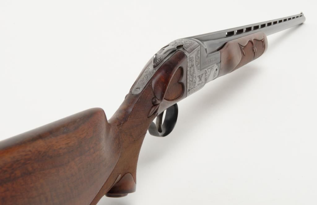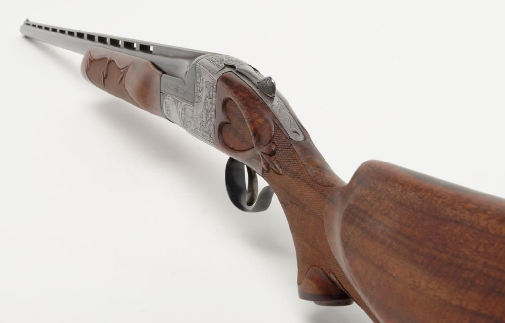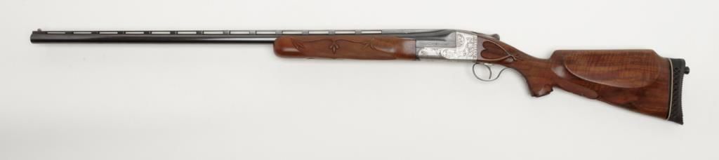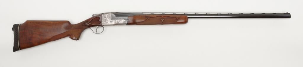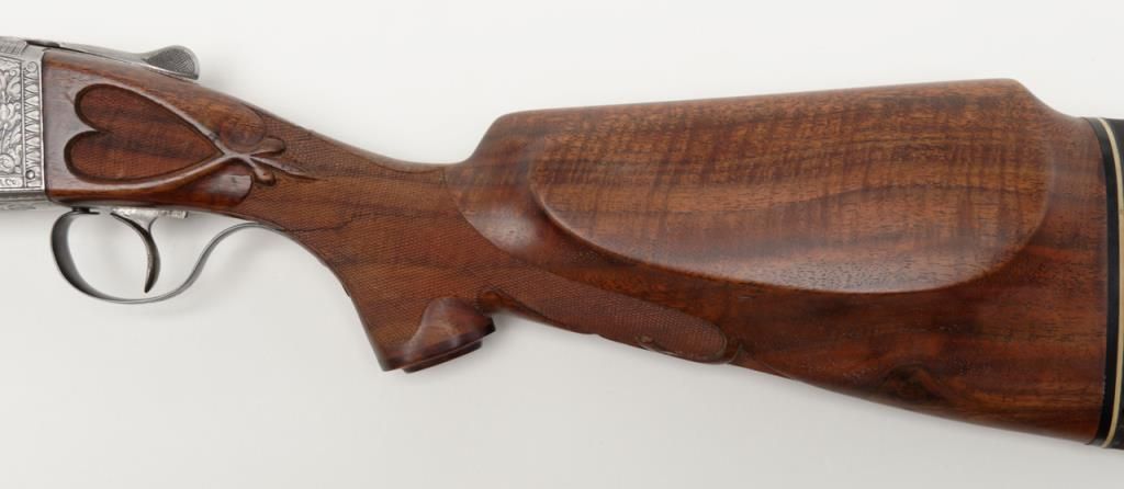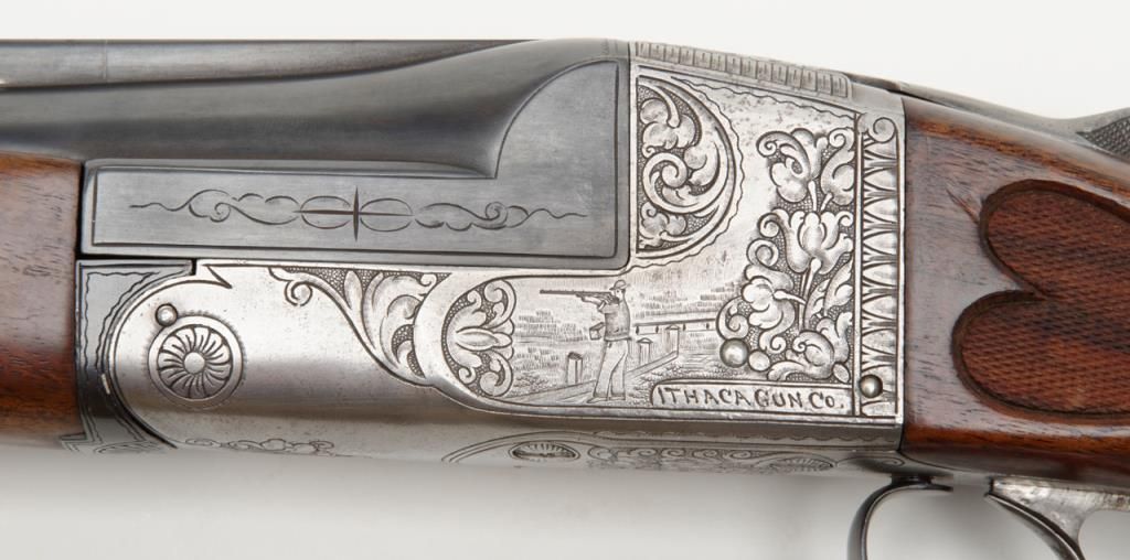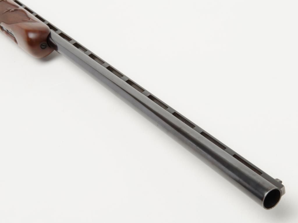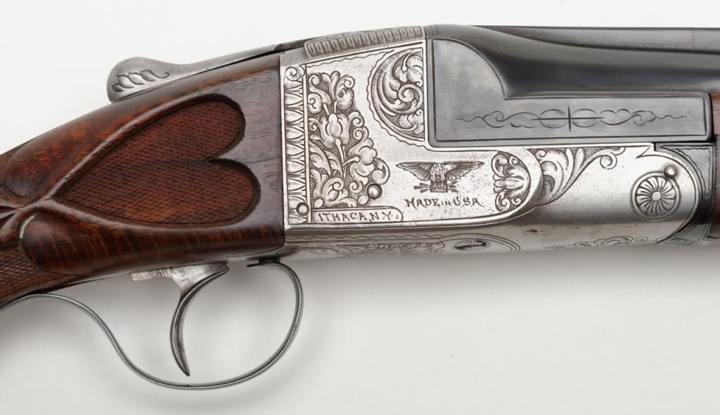 Ithaca Model 4E shotgun, 12 gauge, 32” ventilated rib barrel, single trigger, custom deluxe wood stocks, #401139 in overall very good condition showing the majority of its blue finish on the barrel, near fine bore, crisp action, sharpengraving on the receiver that has gone to silver tone, beautiful deluxe custom finely checkered and raised carved wood stocks showing and expertly repaired break in the wrist, Pachmayr hard rubber butt pad, length of pull is 14-3/8”. (C&R).Est.: $1,250-$2,500