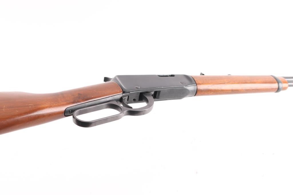 'Saddle Gun'. German made lever action repeating rifle chambered in .22 Long Rifle, produced by Erma 1973-1979. Features a blued 18.5" barrel, full length tube magazine, ramped blade front sight, adjustable rear sporting sight, serrated hammer spur & trigger, black finished receiver with integral scope rail, smooth walnut forend and straight grip shoulder stock with black hard plastic Ithaca Gun buttplate. Bore is pristine, blue finish is about 85% with minor scratches, handling wear on the underside of receiver, wood is very good/sound with minor scratches/dings. Overall very little signs of wear. Condition is NRA Very Good. Modern Firearm.