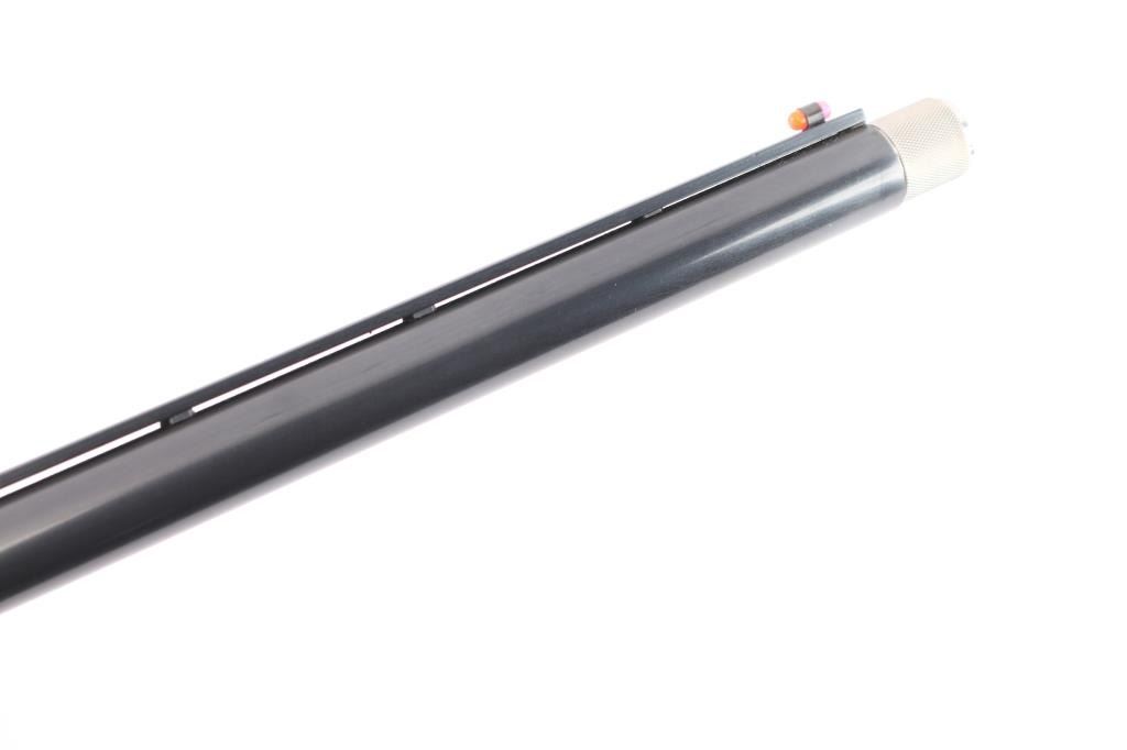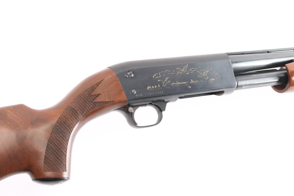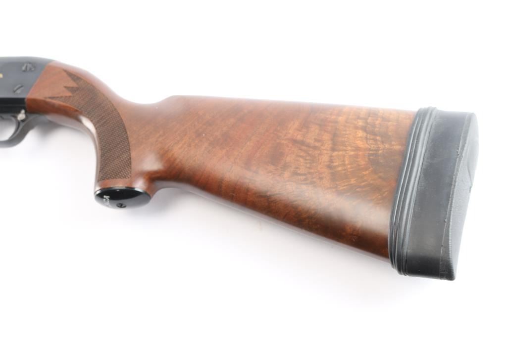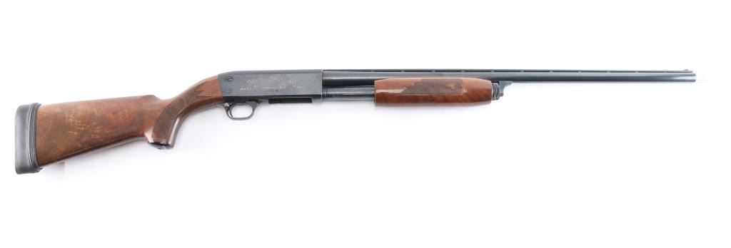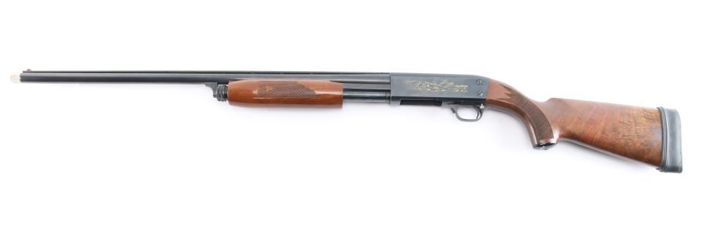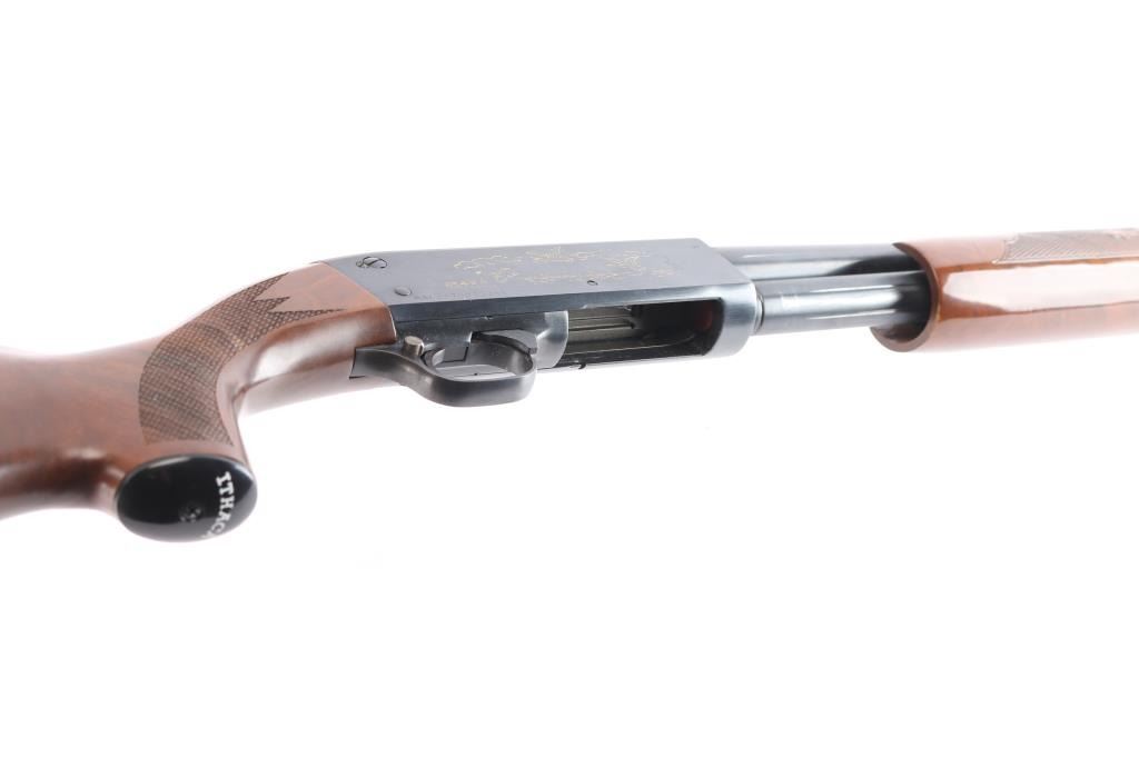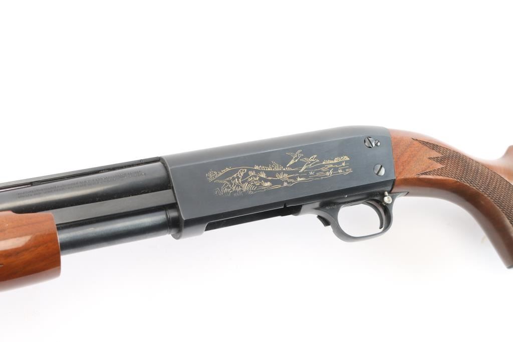 'Featherweight' pump-action .20 ga. shotgun. Re-introduction of the classic Model 37. 26" vent rib barrel, orange fiber-optic sighting blade, 5-rd tube magazine, screw-in chokes, extended Mod. choke installed, push button safety on rear triggerguard. Blued steel. Walnut stock, and forearm with checkered panels at wrist & forearm, factory grip cap solid rubber recoil pad. Water fowl scenes highlighted in a gold tone etched on both sides of receiver. Bore is excellent/bright, wood is excellent, blue is about 97%, with minor edge wear/scratches, action is smooth.