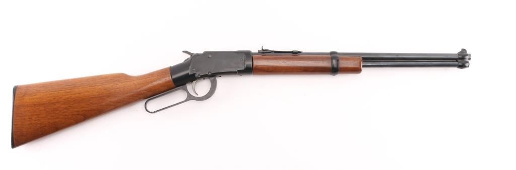 Single Shot tilting block rifle manufactured between 1961 to 1978. Has faux magazine tube to give appearance of a western style lever action rifle. Features blued barrel, black paint finish on receiver and lever, smooth wood stock and forend with Ithaca butt plate, 18" barrel with buckhorn sights and silver look serrated trigger. Bore is excellent, bright. Metal finish on barrel looks good with a loss of paint on the left receiver. Wood stock looks excellent with some very minor scratches. Action is smooth. NRA Condition-Good+. C&R Firearm.