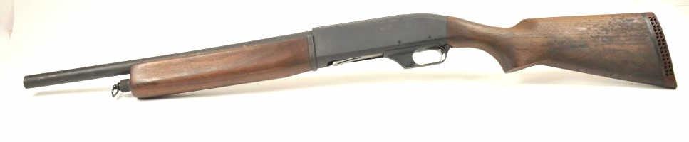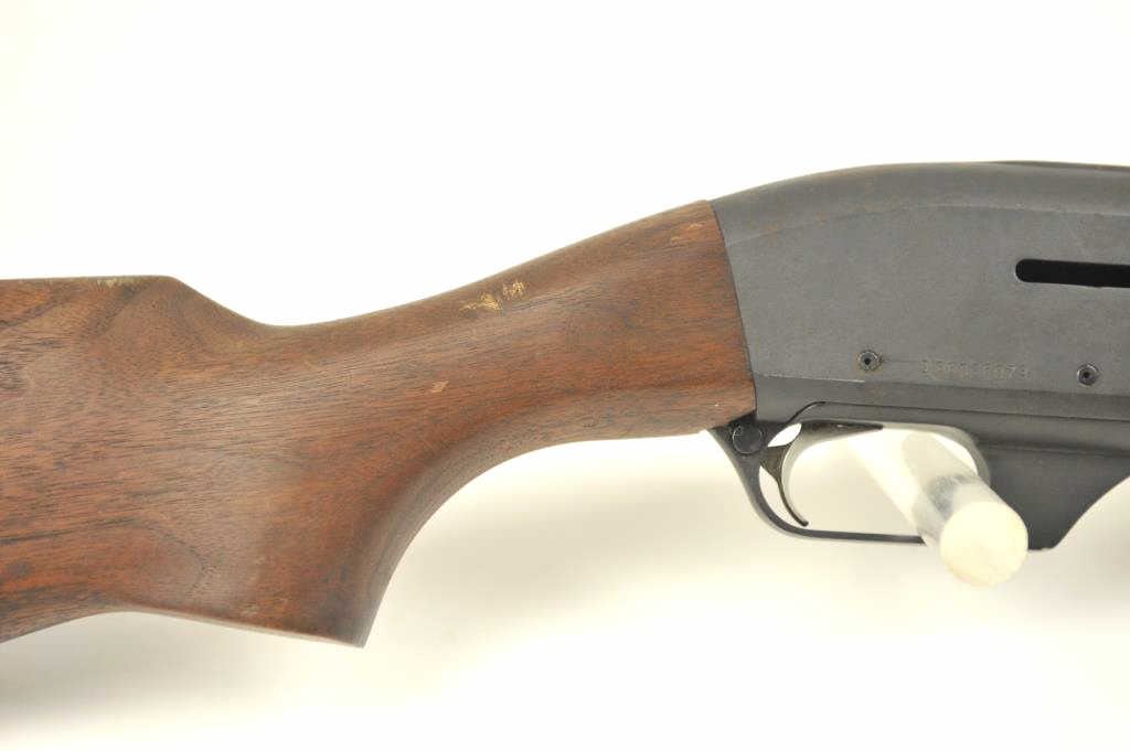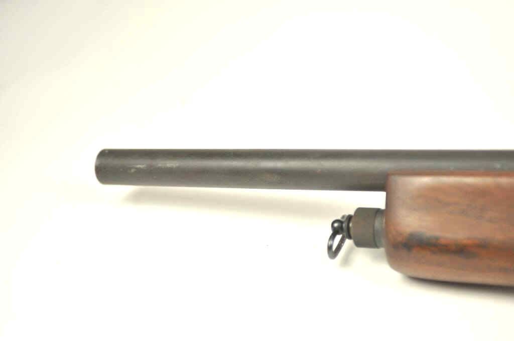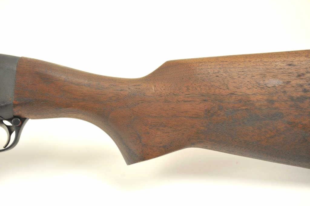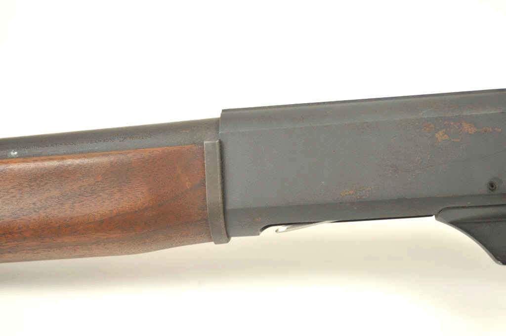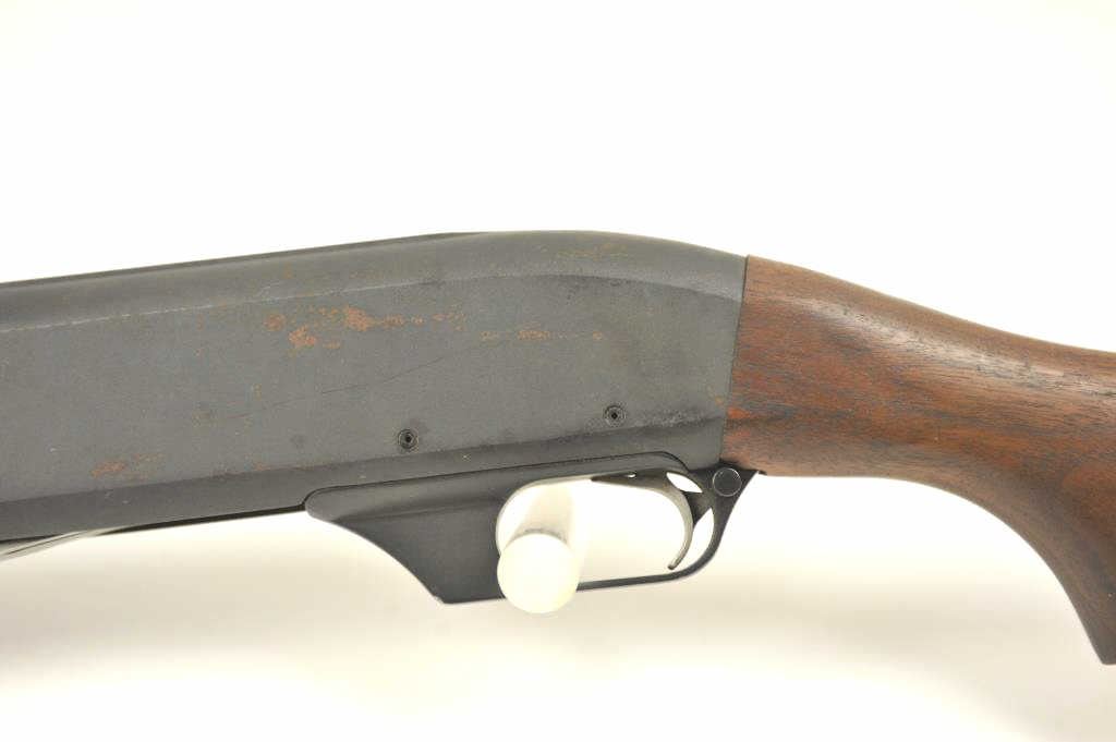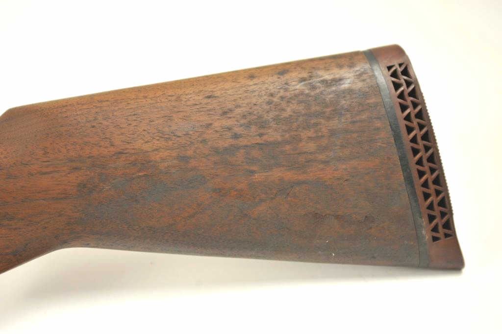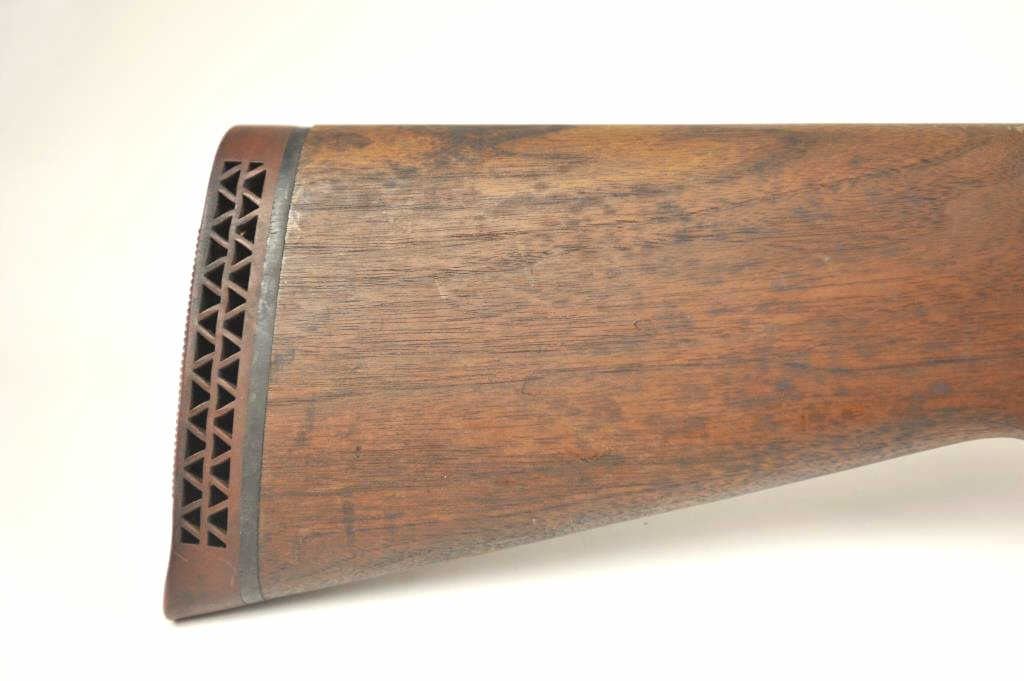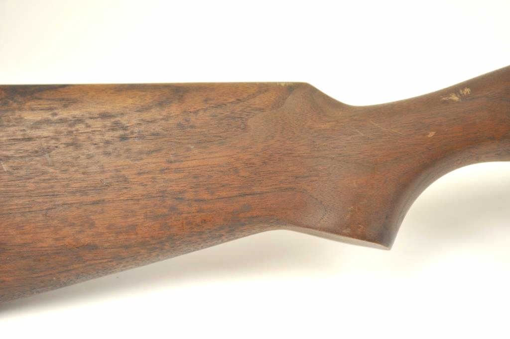 Ithaca Model Mag 10 semi-automatic shotgun, 10 gauge, Serial #100026079. The shotgun is in good overall condition with a shortened 20” barrel with no front sight. The shot gun retains a significant amount of matte bluefinish with mars and scratches. The smooth wood stocks are in good condition showing light sanding, loss of finish on the butt stock and a ventilated rubber pad providing a 14 ½” LOP. The bore is good and the actionworks well. Est.: $200-$400. (Modern).