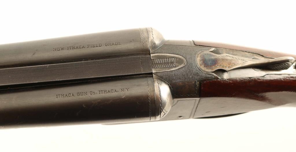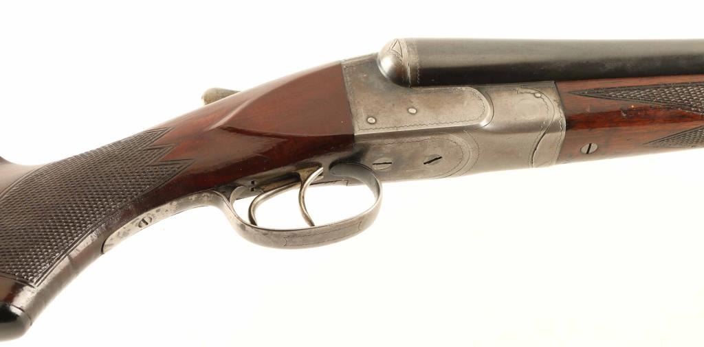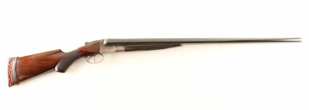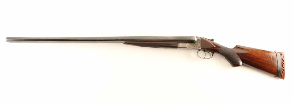 'NID' Vintage American made side-by-side double barrel boxlock shotgun chambered for 2 3/4" 12 gauge shells, manufactured circa 1934-1948. Features blued 30" full/full choked barrels with a knurled concave solid sighting rib, extractor, brass bead front sight, double trigger, case hardened receiver with stippling & simple border engraving, knurled top lever, sliding tang safety, hand checkered walnut splinter forend with inlayed tip and Prince of Whales grip shoulder stock with black grip cap, spacers & factory recoil pad. Barrels retain approximately 70% of their original blued finish showing carry wear/thinning, light muzzle wear with some pin prick pitting and scattered handling marks. The receiver displays traces of finish with the majority of the metal surfaces bearing a browning patina. Action is crisp, the bores are bright, markings are sharp and the refinished wood stocks are near good with a 2" crack in the forend, many blemishes & 12" LOP to the wood. Condition is near NRA Good. ***C&R Firearm***