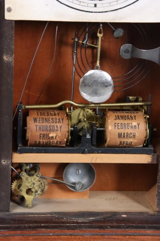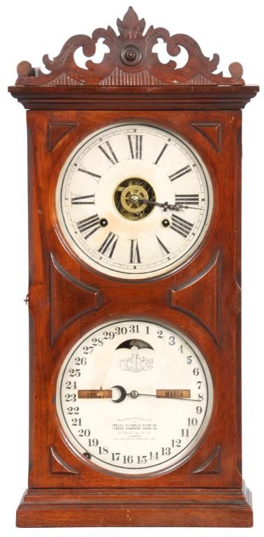 Ithaca No. 10 Farmers Double Dial Shelf Clock. Has pierced blued hands, 8 in. paper dial with Roman hour numerals and open center with alarm indicator disc; 8 day, pierced brass spring driven movement made by E.N. Welch for the Ithaca Cal. Clock Co. and numbered 8615, has count wheel strike mechanism with coiled gong and silvered pendulum bob; lower perpetual calendar mechanism with 8 in. paper dial having 31 date numbers and aperture cutouts exposing the day and month cylinders, alarm mechanism in the base runs on its own spring driven movement. In a walnut case with raised panels on the door and pierced carved crest with center rosette; crest is repaired, case has an overcoated finish. 26 in. high x 12.5 in. wide x 5.25 in. deep.