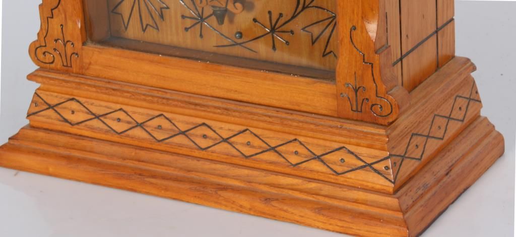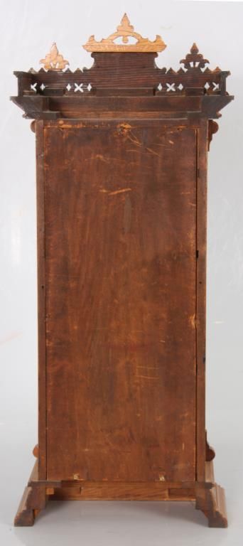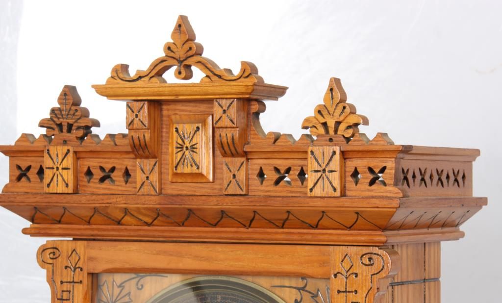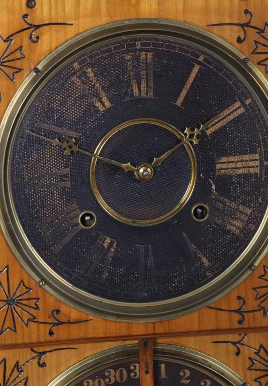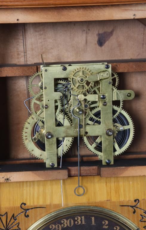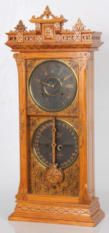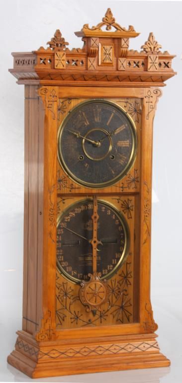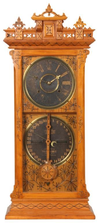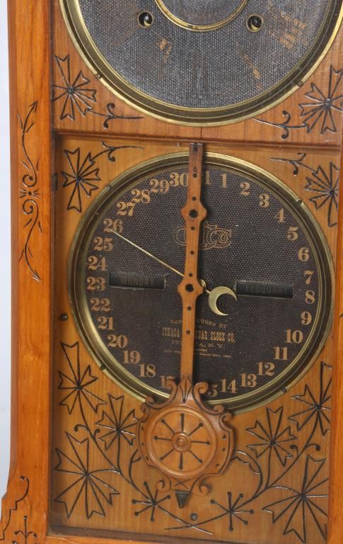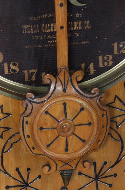Ithaca No 6 1/2 Shelf Belgrade Double Dial Calendar Clock. Original 8 in. black dial has gilt Roman hour numerals, pierced brass hands; brass 8 day spring driven movement by E.N. Welch, Made for Ithaca Clock Co. has an hour strike on a coiled gong and long carved wood pendulum & bob. Original black 8 in. lower calendar dial has 31 date numbers outside with open aperture cutouts exposing the month & day cylinders; has a good brass perpetual calendar mechanism in working condition, original black labels. In an ash case with pierced carved crest and black incised highlights throughout, in good condition with a cleaned original finish. 32.5 in. high x 14 in. wide x 7 in. deep.
