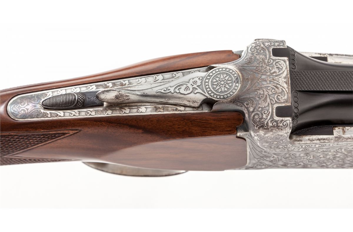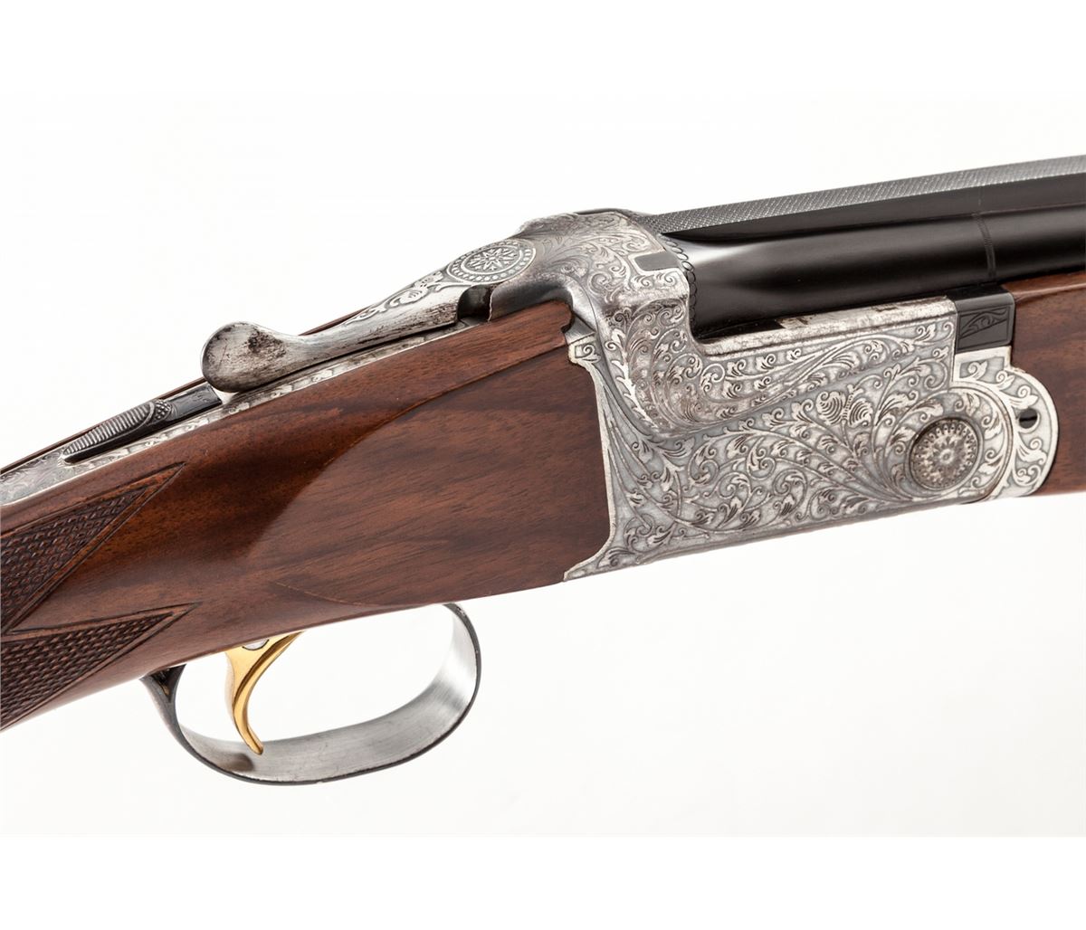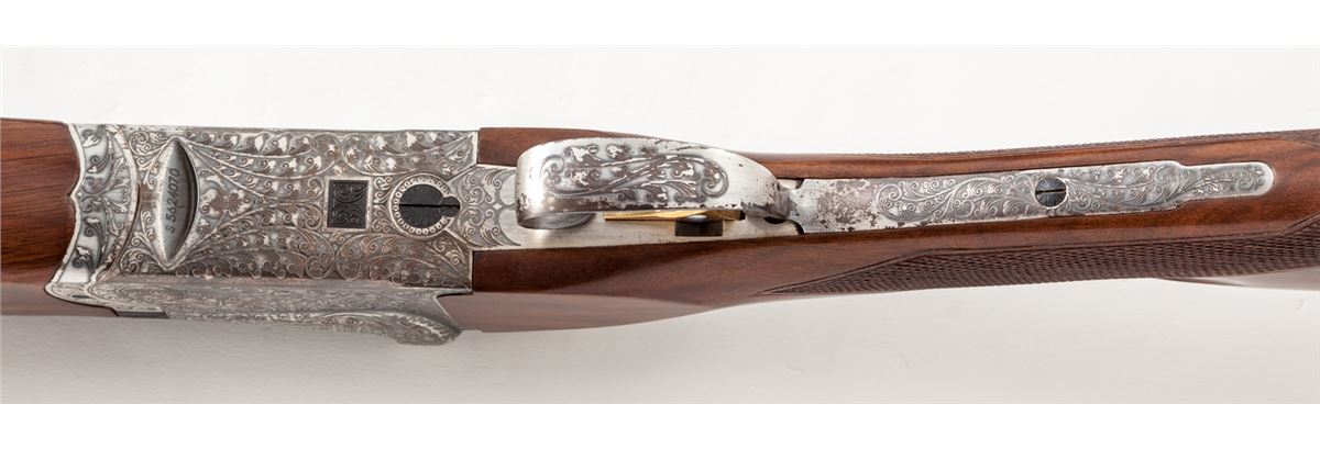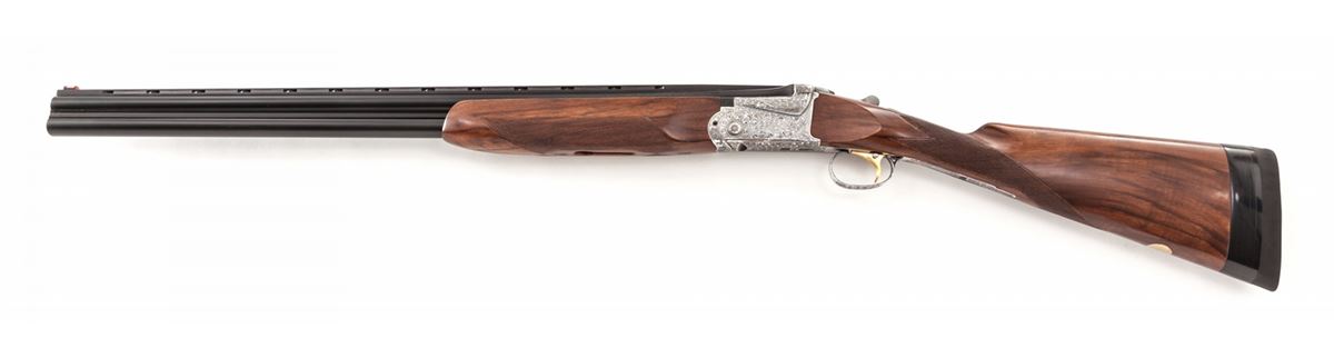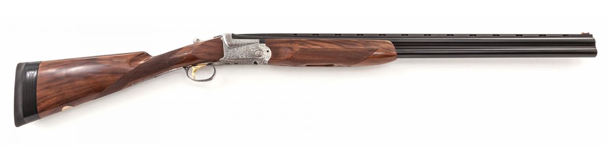Ithaca SKB English Model 680 Over/Under Shotgun, #S5624070, 12 ga., 2-3/4'' chs., 28'' barrels with matte blue finish and ventilated rib, red fiber front and silver middle bead, choked Full/Mod., gold-plated single selective inertia trigger, manual sliding top tang safety, silver plated frame with etched vine scroll engraving and side bolsters; straight hand, satin finish walnut stock and field forend with a 13-3/4'' length of pull over a 3/4 black Decelerator pad with an additional 1'' of plastic spacers and brass oval on toe line. Overall condition remains fine showing only slight use. Action is sound, bores are bright, ejectors are strong, wood with minor handling marks, 99% blue and 95% silver plate with tarnish and flaking. Est.: $400-$600. (Modern)