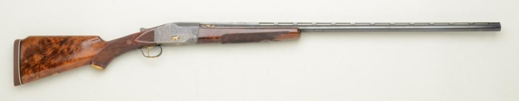 Ithaca Souza Grade 12 gauge single barrel trap shotgun, elaborately factory gold inlaid and engraved with mermaid on trigger guard, #306150T. The gun shows a 34" ventilated rib barrel, choked improved modified. The leftside of the frame shows a gold inlaid hunting dog surrounded by tight engraved scrolls, with engraving extending onto barrel and gold high relief bird and scrolls at left rear of barrel. The engraving also extends onto the right side of the frame and barrel with matching gold dog and bird inlays; the bottom of the frame is tightly engraved "en suite", the center portion on the bottom of the frame shows and inlay of landing duck onwater. The trigger guard shows mermaid as previously mentioned. The barrel shows approximately 98% expertly re-blued finish and frame shows traces of original case hardening drifting to gray with some colorful areas where protected. The trigger guard shows 80% thinning blue. The stocks are also professionally refinished with fancy flaming burl wood grain, fine checkering with fancy panel behind action. An old original to the