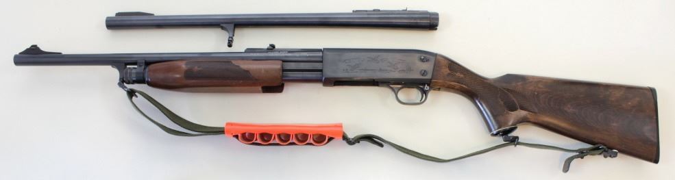 Ithaca model 37 Deer Slayer 20 ga. SN 371529929 pump action shotgun with 19" smooth bore barrel, open rifle sights, blued finish, walnut checkered stocks and nylon sling. Shows good used condition with some scattered marks. "King of the .22"s" target rifpump action shotgun with 19" smooth bore barrel, open rifle sights, blued finish, walnut checkered stocks and nylon sling. Shows good used condition with some scattered marks. "King of the .22"s" target rifle made in 1924 fitted with standard 28" round barrel, front dovetail blade and Lyman target rear sights, leather sling and scope blocks. Barrel show approx. 85% original finish the walnut stock with several light dings and scratches, receiver drifting to plum. Original 5shot magazine remains with rifle. Very good overall condition including action. Bore good and may clean to very good. Includes a second barrel 19 1/2". From old St. Louis collection. FFL/Modern. Est. 200-350