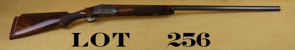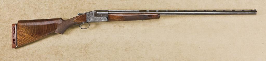 Ithaca model 4E 12ga single barrel trap shotgun, factory 34” barrel, blue and case hardened finish, serial number 306164T. The remains in good original condition showing approx. 30-50% original blue on barrel withsome cleaning, toning, and drifting to patina, and some just starting erosion and pinprick pitting. The frame is nicely engraved and shows a trap shooter on left, and American eagle with arrows on right. Theframe shows 10-30% evenly drifting and toning case hardening going to silver. The trigger guard and collar have retained most of their original blue. The stocks are good one or two small losses at the edges, some scratches,light cleaning, and approx. 30% original varnish remains. The stock measures approx. 13-1/2” from the trigger to the end of the wood, and has been slightly reduced with a poorly fit undersized recoil pad added. Theaction is good, the bore very good. Would improve considerably with a proper butt pad. Est.: $900-$1800.