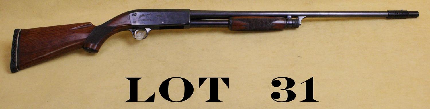 Ithaca pump action shotgun, 20 gauge, modified choke, 26” barrel including muzzle Weaver added choke, blue finish, checkered wood stocks, #19874. This gun is in overall good condition showing the majority of itsoriginal blue finish, very good bore, crisp action, sharp markings, overall good wood stocks showing some scattered nicks and mars from carry and storage and several hairline cracks to the right side of the butt stock at the back of the receiver; black hard rubber butt pad is oversized and worn. Est.: $225-$325.