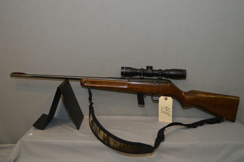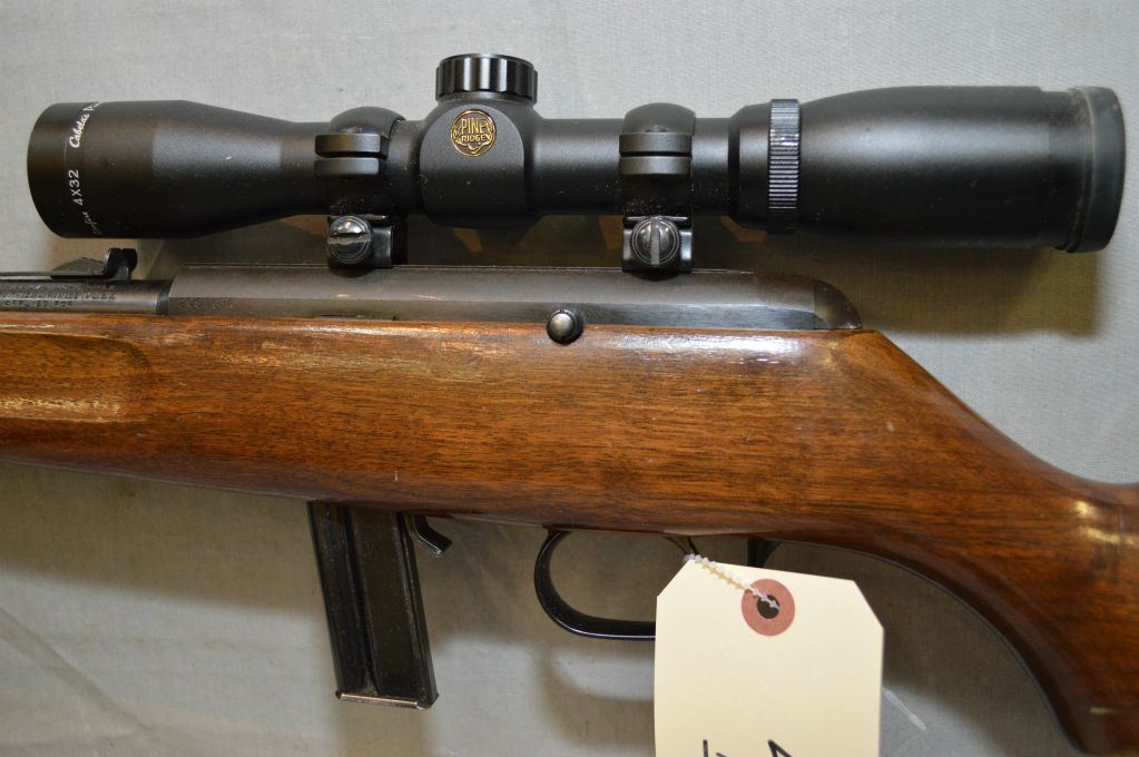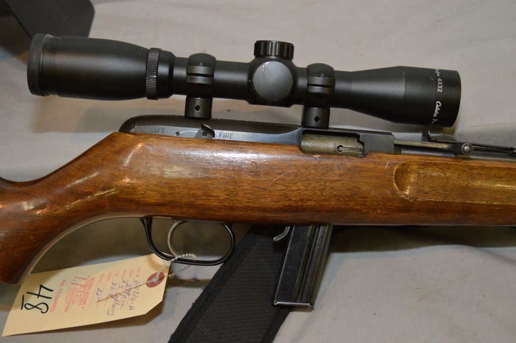 Ithica Model X5 Lightning .22 LR cal Mag Fed Semi Auto Rifle w/ 22" bbl [ blued finish starting to fade, mostly on end of barrel, barrel sights, also fitted w/ Cabelas Pine Ridge Rim Fire 4 x 32 scope, pistol grip wooden stock w/ Ithica butt plate, Butler Creek nylon & padded sling w/quick off swivels ] Ser # 20810-A