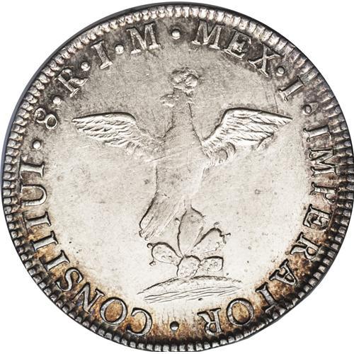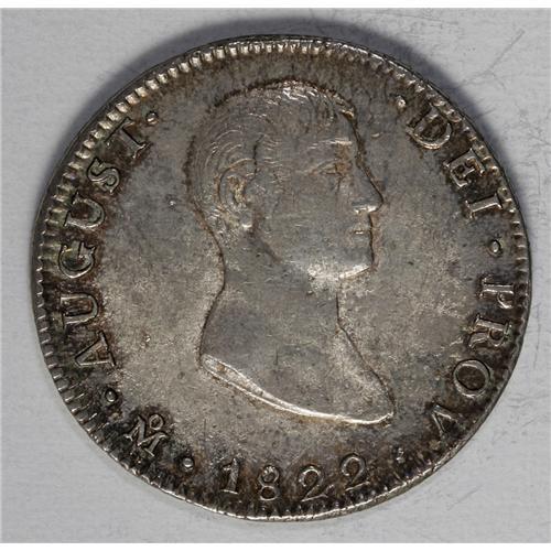 <B>Iturbide 8 Reales 1822-Mo JM,</B></I> KM-304, attractive XF-AU, residual luster, normal softness of strike, but well centered, flan stress showing especially on reverse, light silvery amber-gold iridescence.<BR><I>From the Monedas Oro Collection</B></I><BR><BR><b>Shipping:</b> Coin/Currency (<a target="_blank" href="http://www.heritageauctions.com/common/shipping.php">view shipping information</a>)