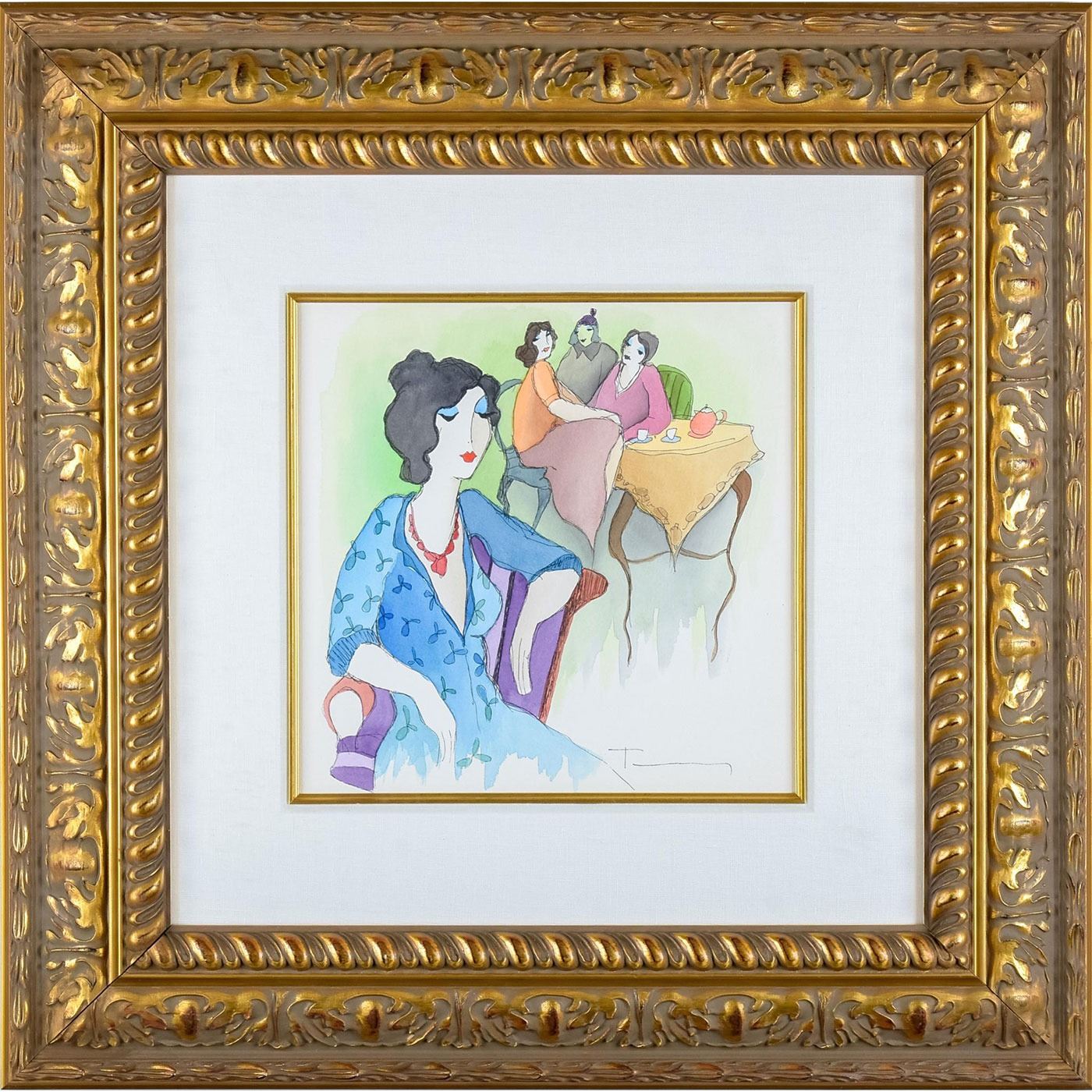 Features four women in cafe. Many colors laid over one another to create texture and transparency. Signed lower right, ink. Housed in gold ornate frame with white matte. Good condition. Sight size: 11.5"H x 11.5"W. Frame size: 25"H x 25"W. #tarkay #serigraph #atport
