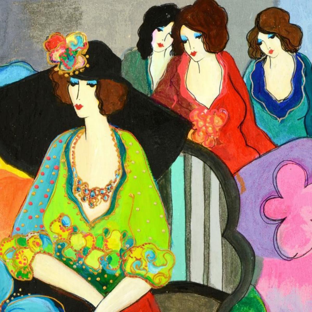 This is a one-of-a-kind acrylic over paint on wood panel by Itzchak Tarkay (1935-2012), hand signed by the artist. Includes Letter of Authenticity. Measures approx. 12" x 9" (image). Reference #: 245542